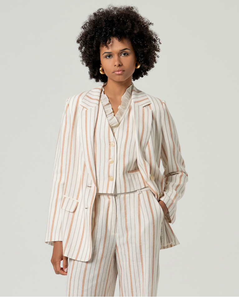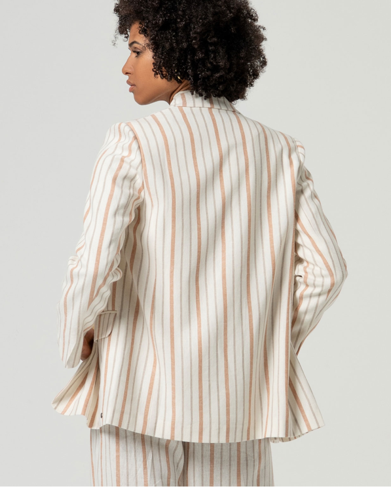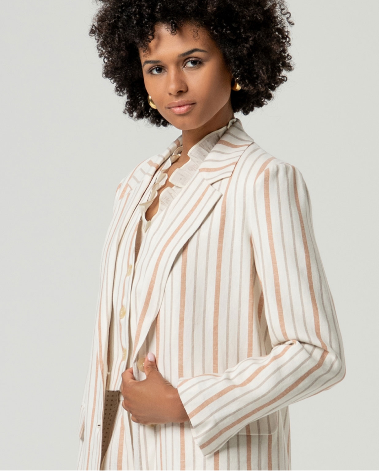 Blazer con revers a punta e maniche lunghe. Taglio dritto con motivo a righe verticali, chiusura con bottoni e tasche con patta. Realizzato in un leggero misto lino e cotone.