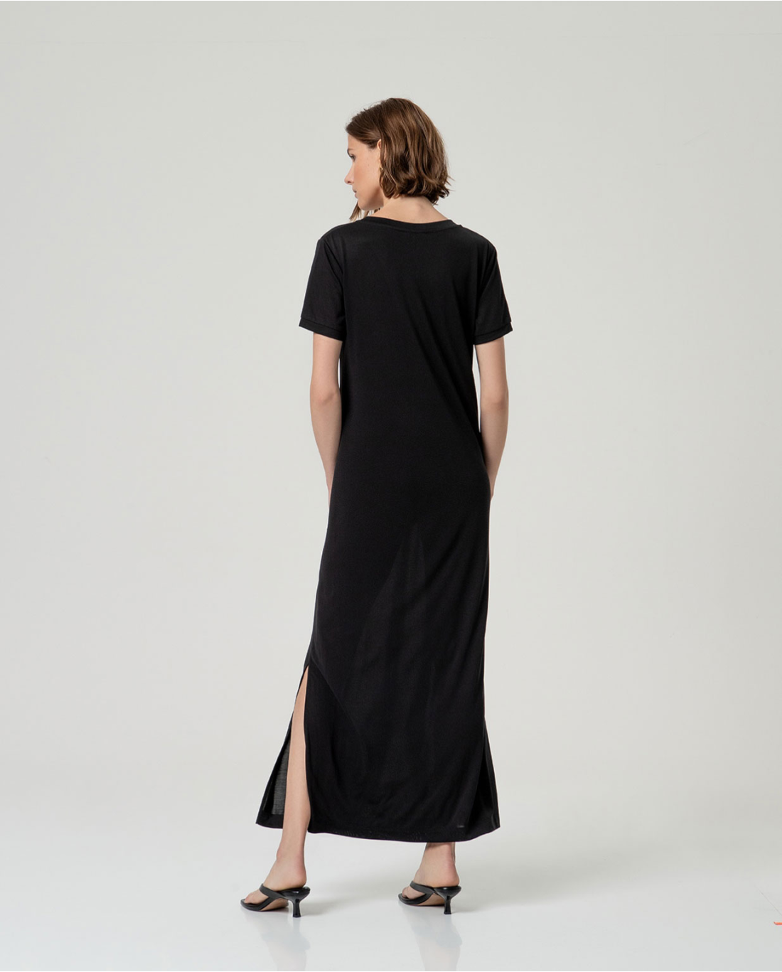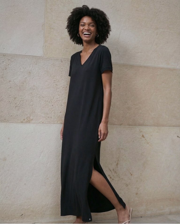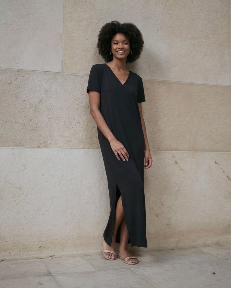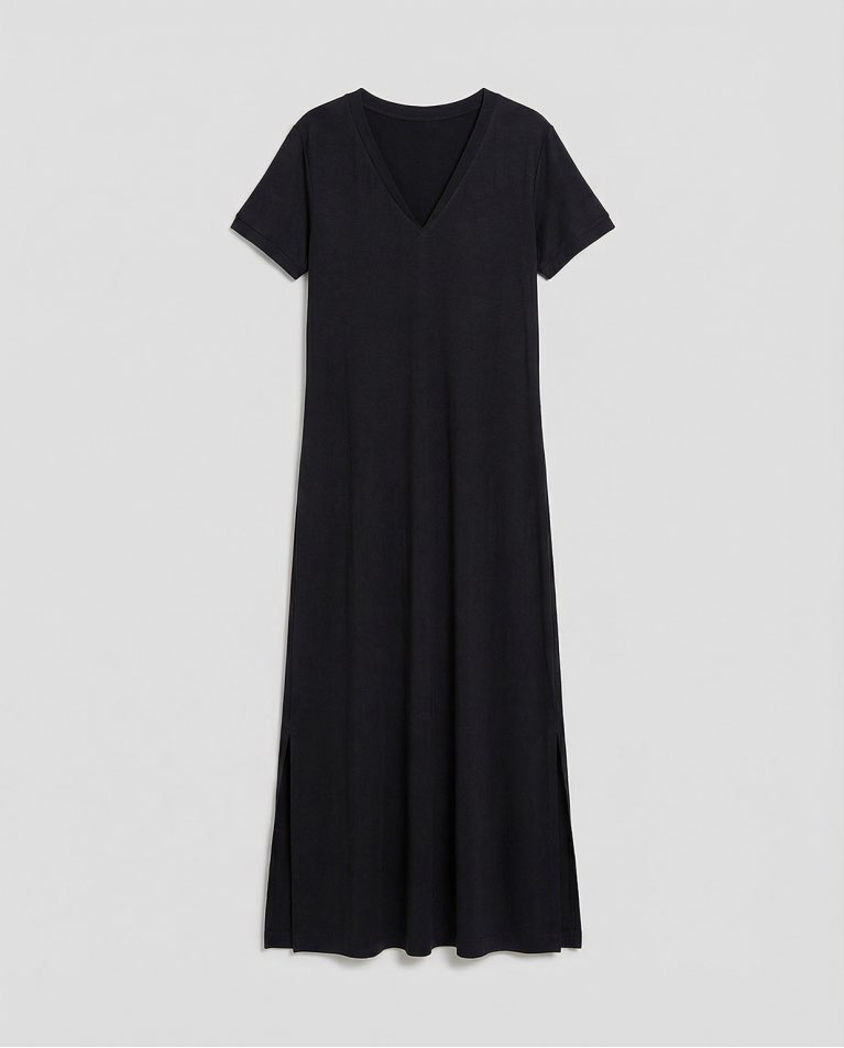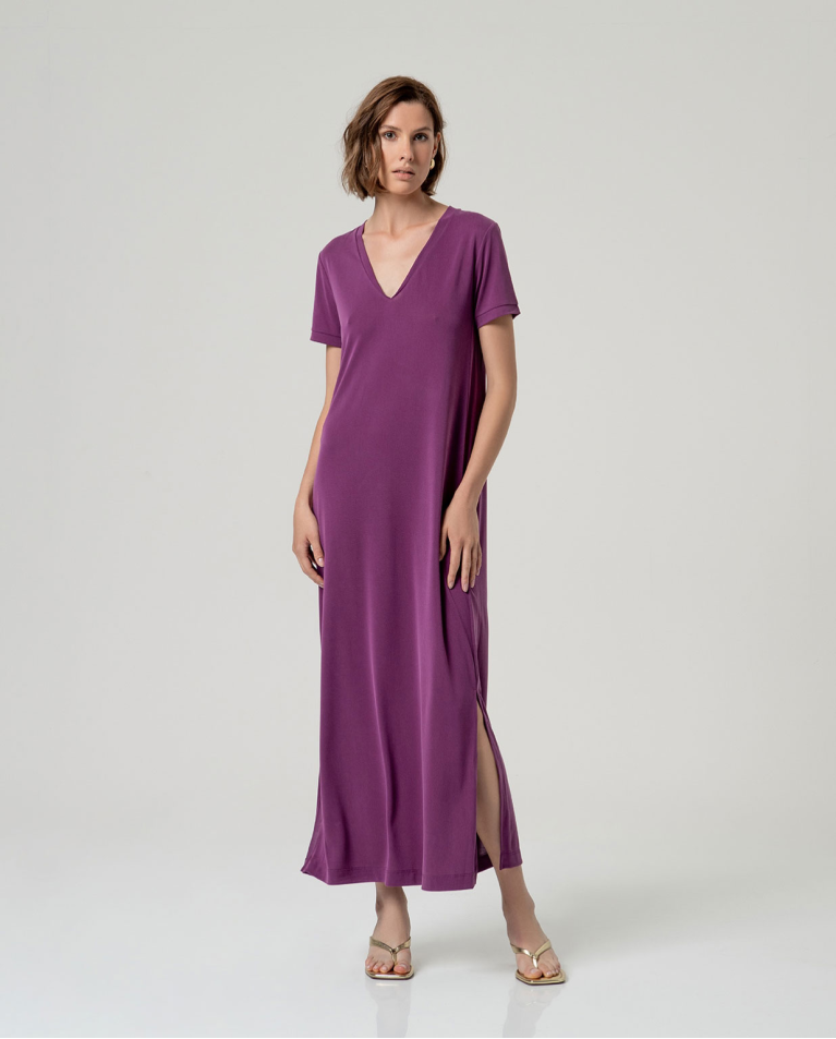 Abito lungo e semplice con maniche corte e scollo a V. Modello dritto con spacchi laterali e lunghezza maxi. Realizzato in un tessuto fluido misto modal e poliestere.