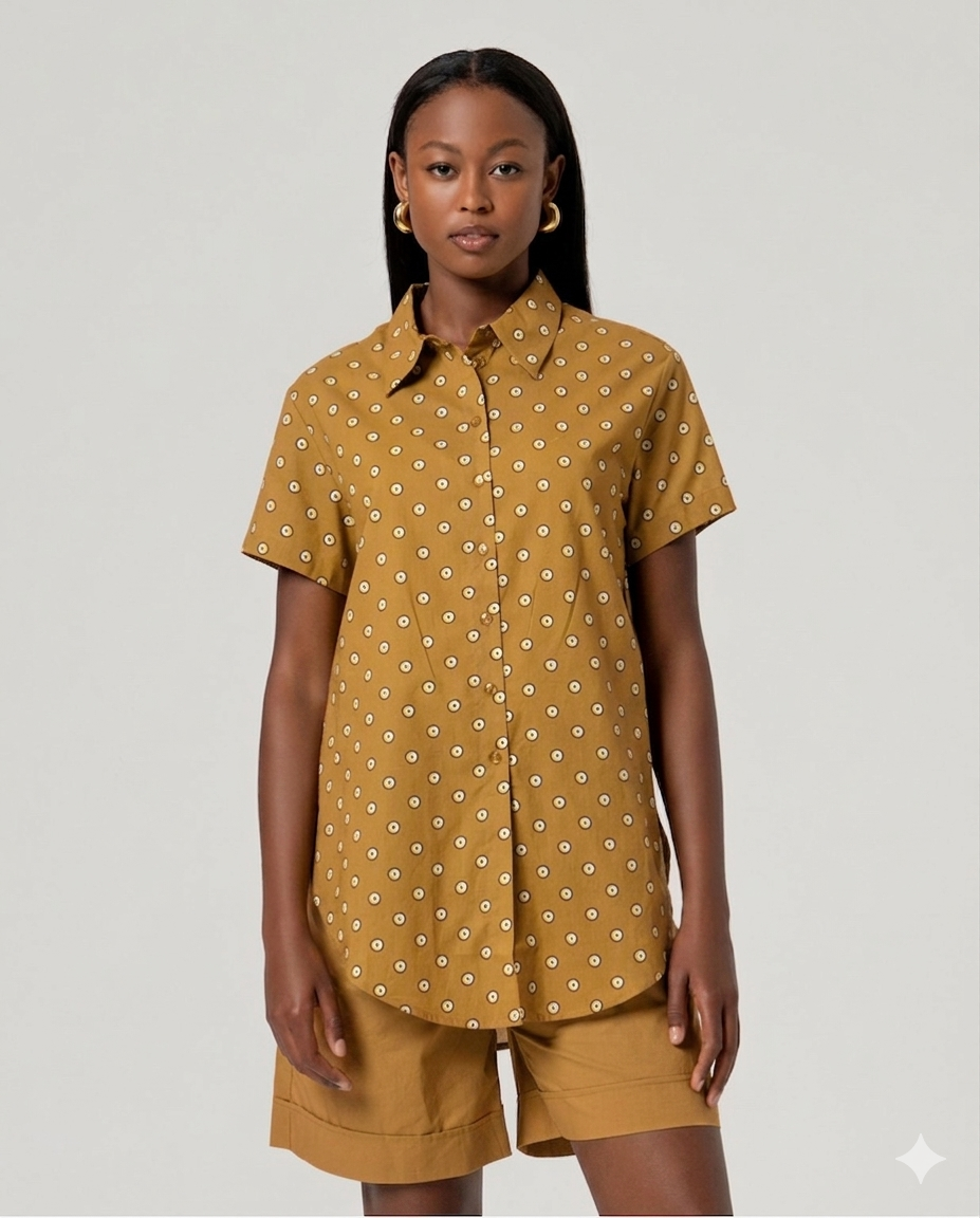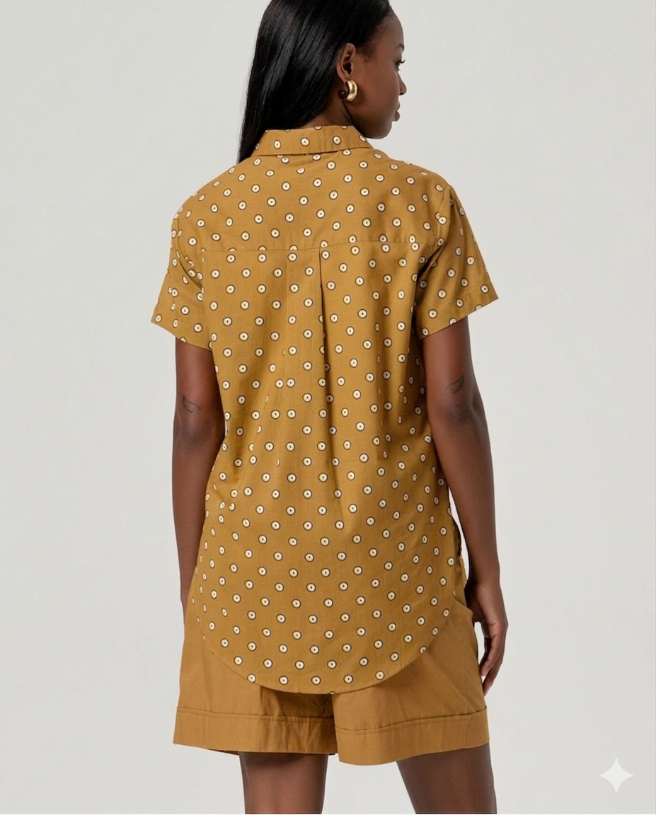 Camicia lunga a maniche corte con colletto classico e chiusura frontale con bottoni. Silhouette dritta con orlo leggermente arrotondato e stampa geometrica all-over. Realizzata in 100% cotone.