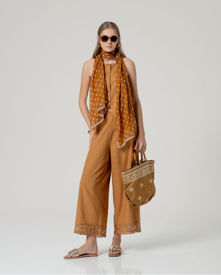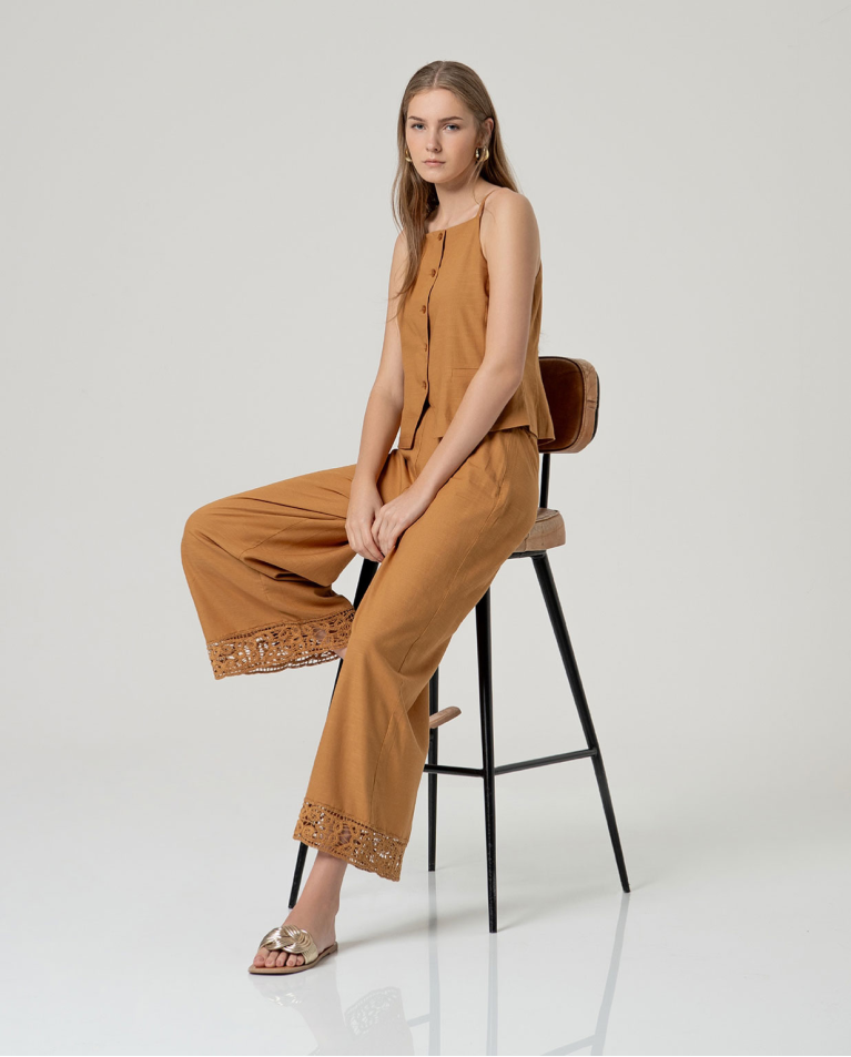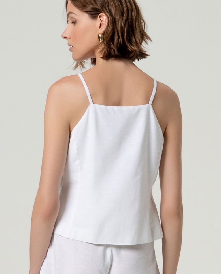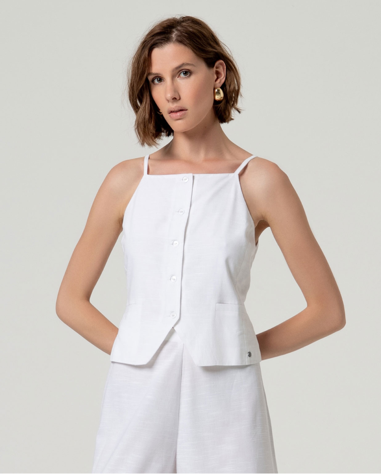 Canotta strutturata con scollo dritto e chiusura frontale con bottoni. Silhouette dritta con orlo leggermente svasato e finitura pulita. Realizzata in un leggero misto viscosa e cotone