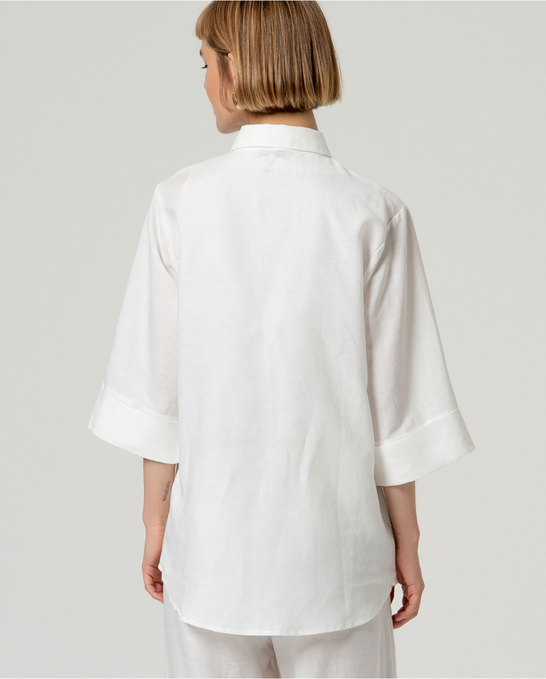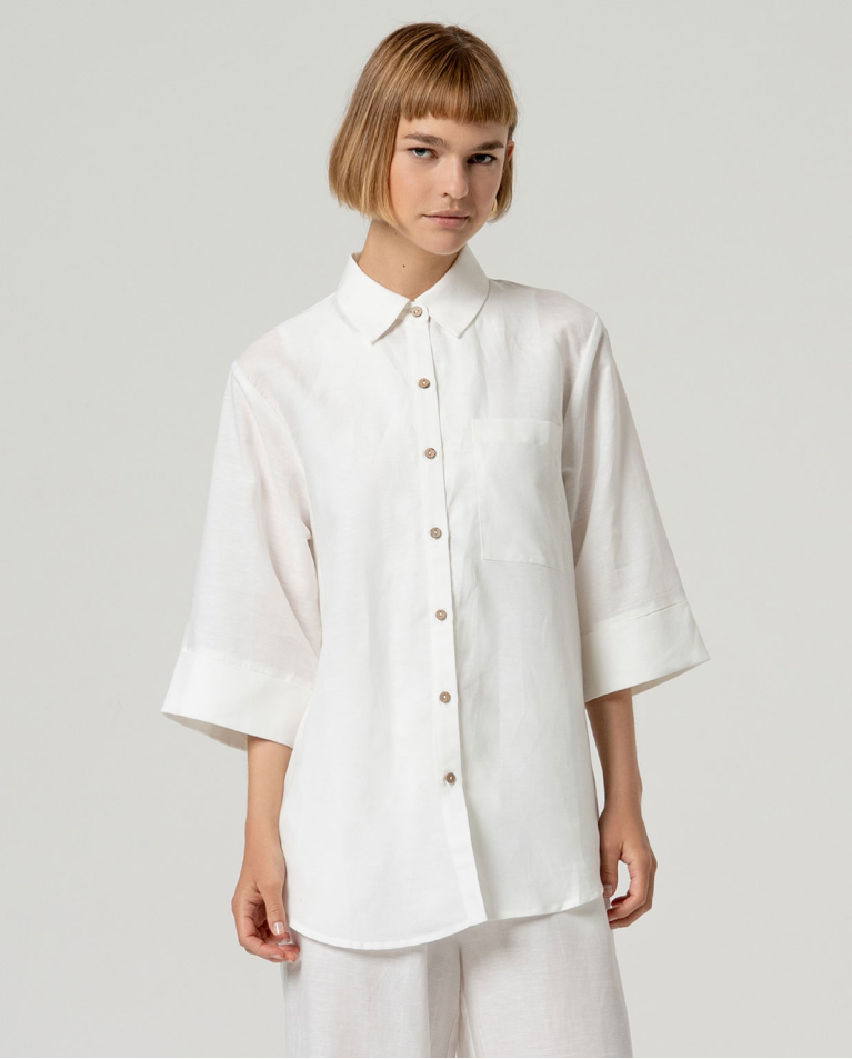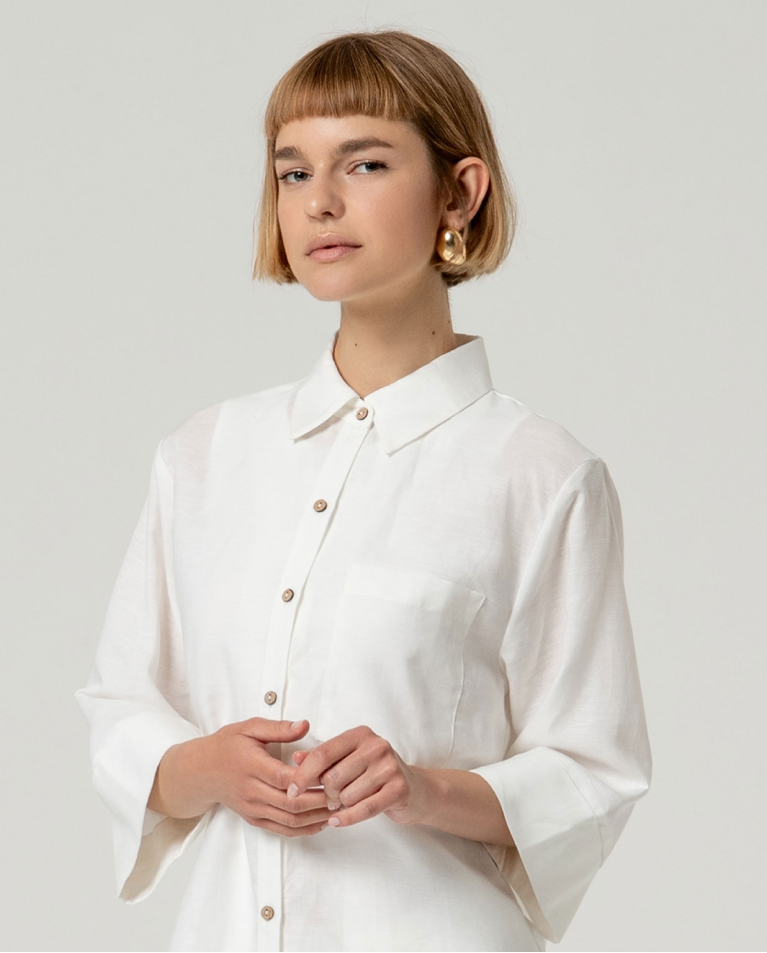 Camicia lunga con colletto classico e maniche a tre quarti. Modello dalla silhouette dritta con chiusura a bottoni e orlo dritto. Realizzata in un leggero misto lino e viscosa.