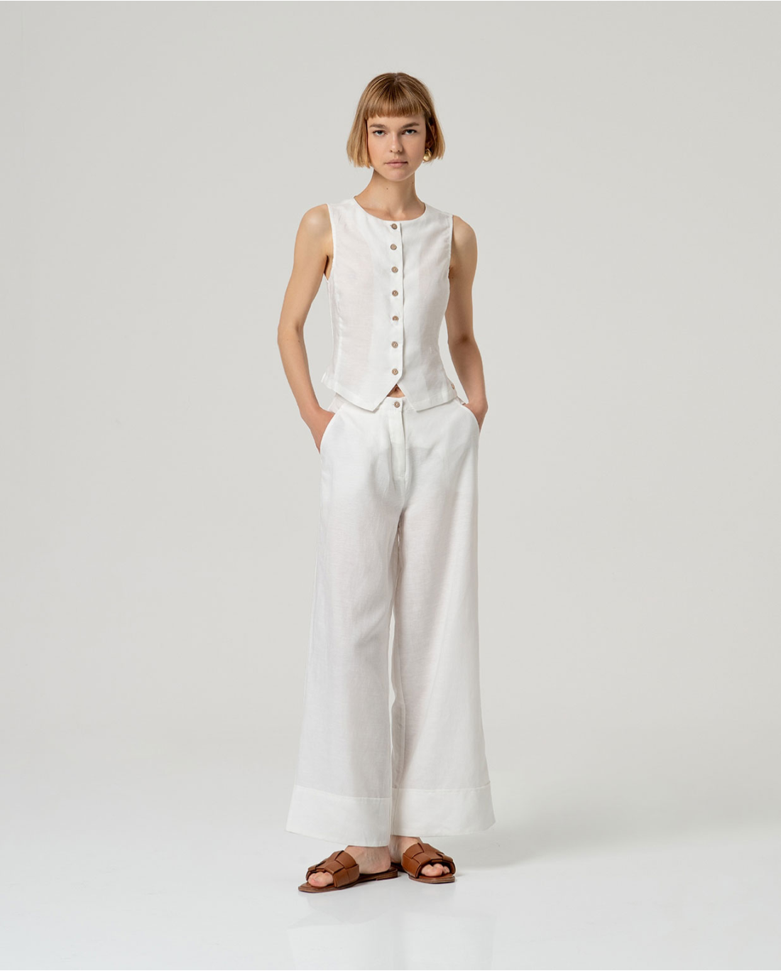Pantaloni a gamba larga con vita media. Presentano chiusura frontale con zip e bottone, tasche laterali e elastico in vita sul retro per una vestibilità comoda. Realizzati in un leggero misto lino e viscosa.