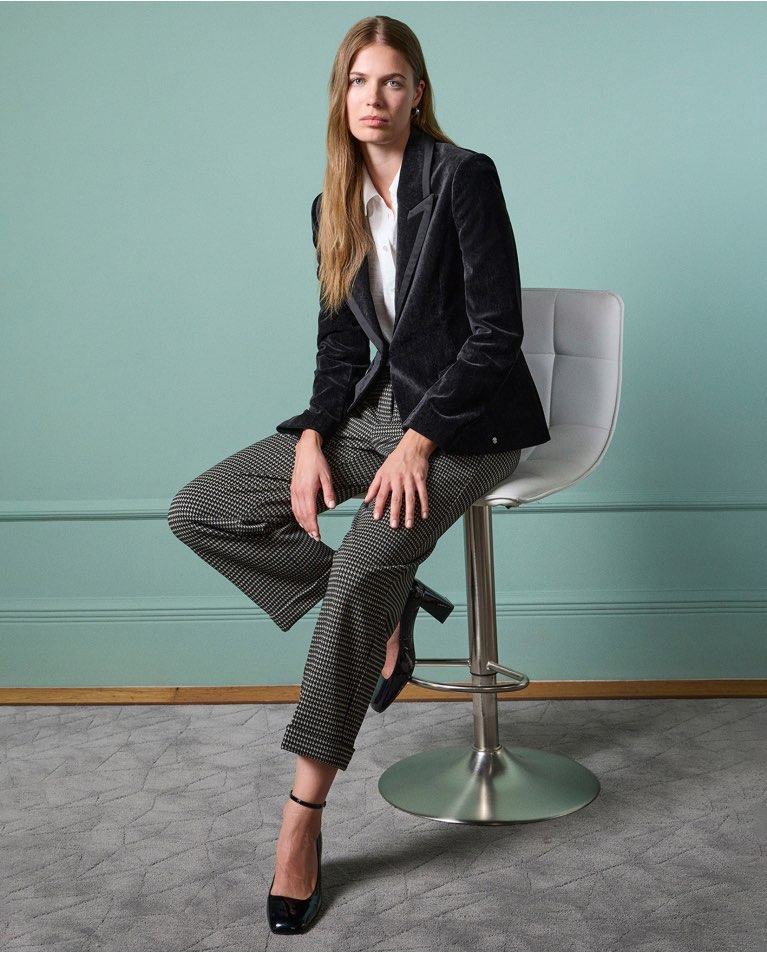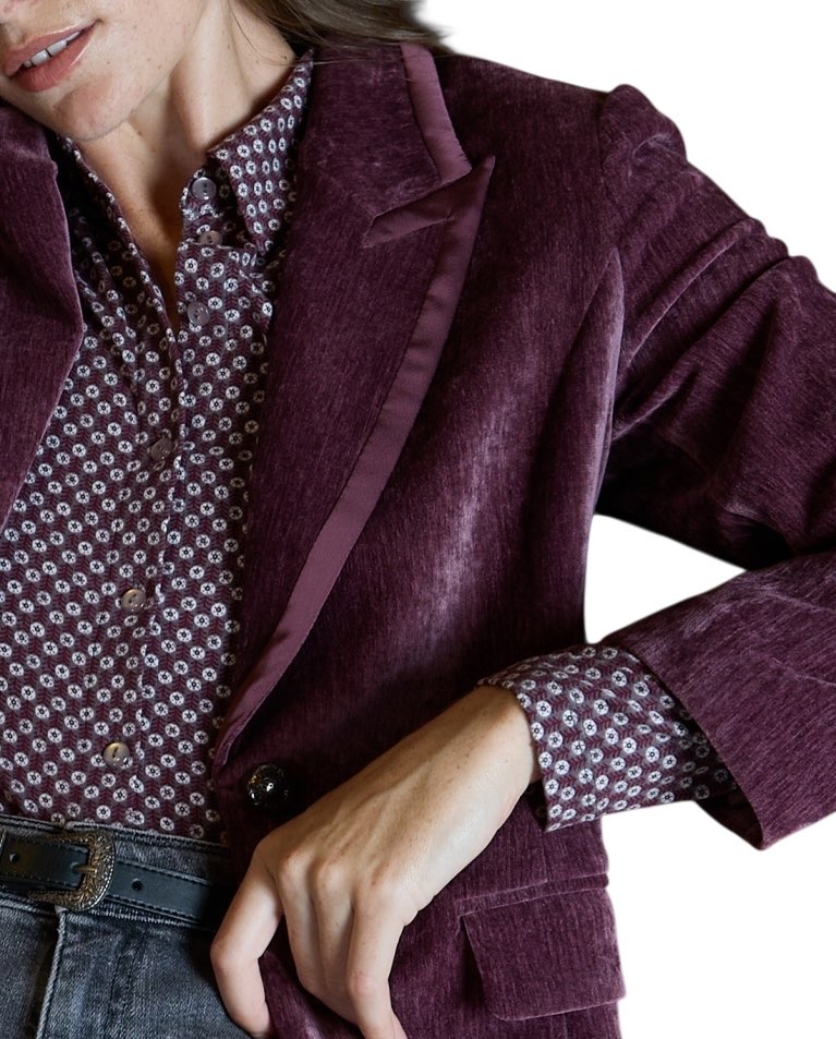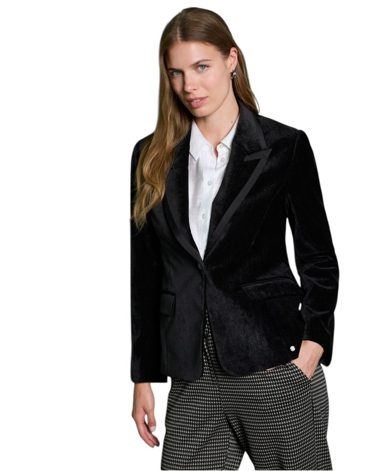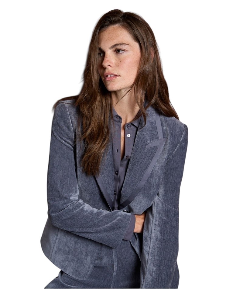 Blazer dal taglio classico reinventato con un colletto originale e un tessuto effetto velluto con acque. Morbido al tatto, con un tocco lucido ed elegante, è realizzato in un tessuto elasticizzato che offre comfort senza rinunciare allo stile. Ideale 95% poliestere 5% spandex.