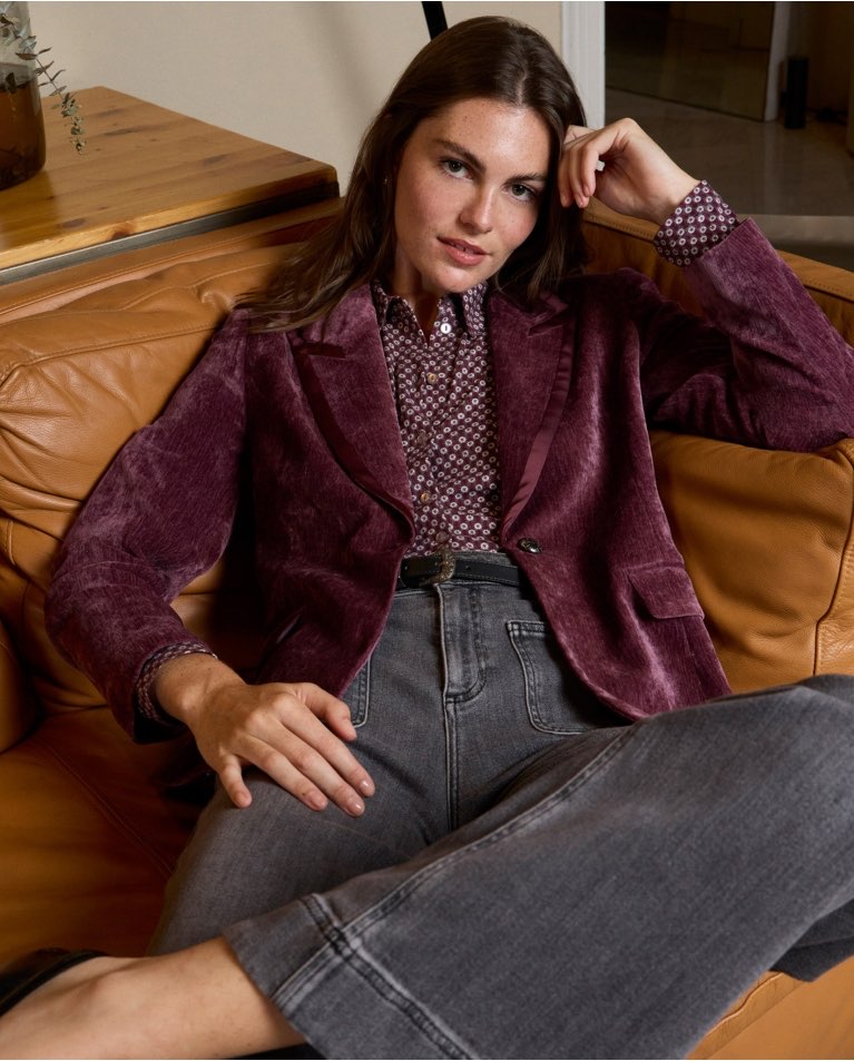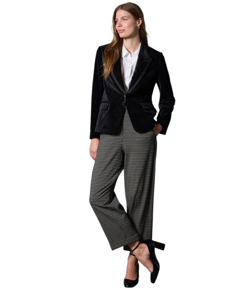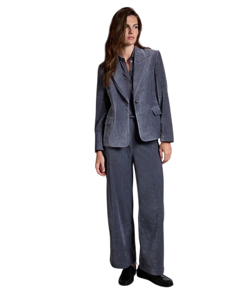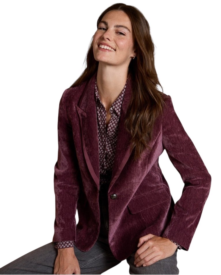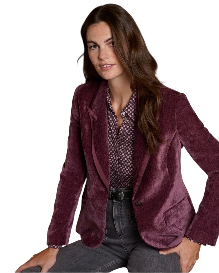 Blazer dal taglio classico reinventato con un colletto originale e un tessuto effetto velluto con acque. Morbido al tatto, con un tocco lucido ed elegante, è realizzato in un tessuto elasticizzato che offre comfort senza rinunciare allo stile. Ideale 95% poliestere 5% spandex.