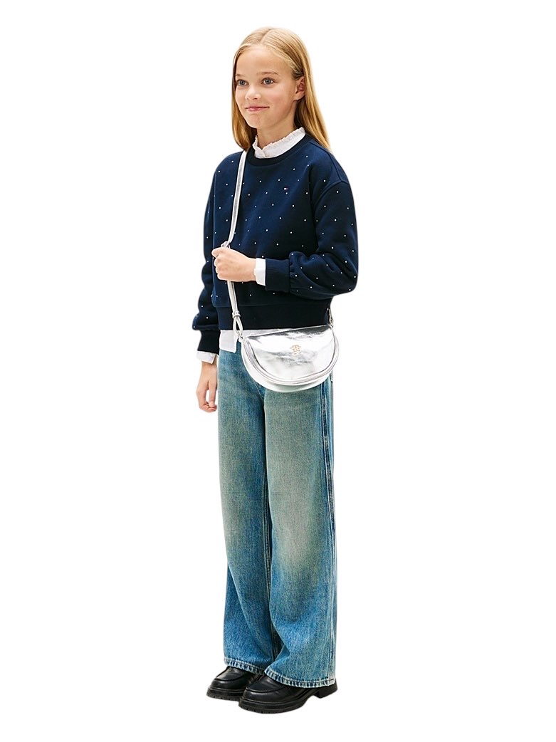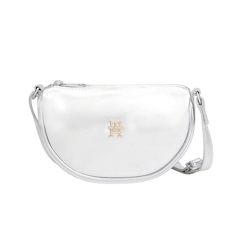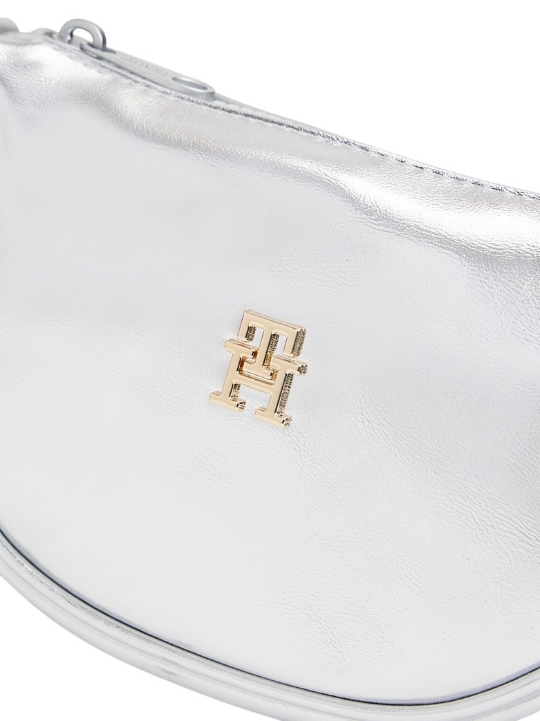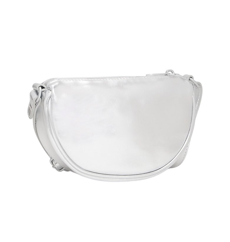 La borsa a tracolla, ideale per le feste, è valorizzata dalla particolare forma a mezzaluna e dalla finitura metallizzata che regala una nota brillante ai look.