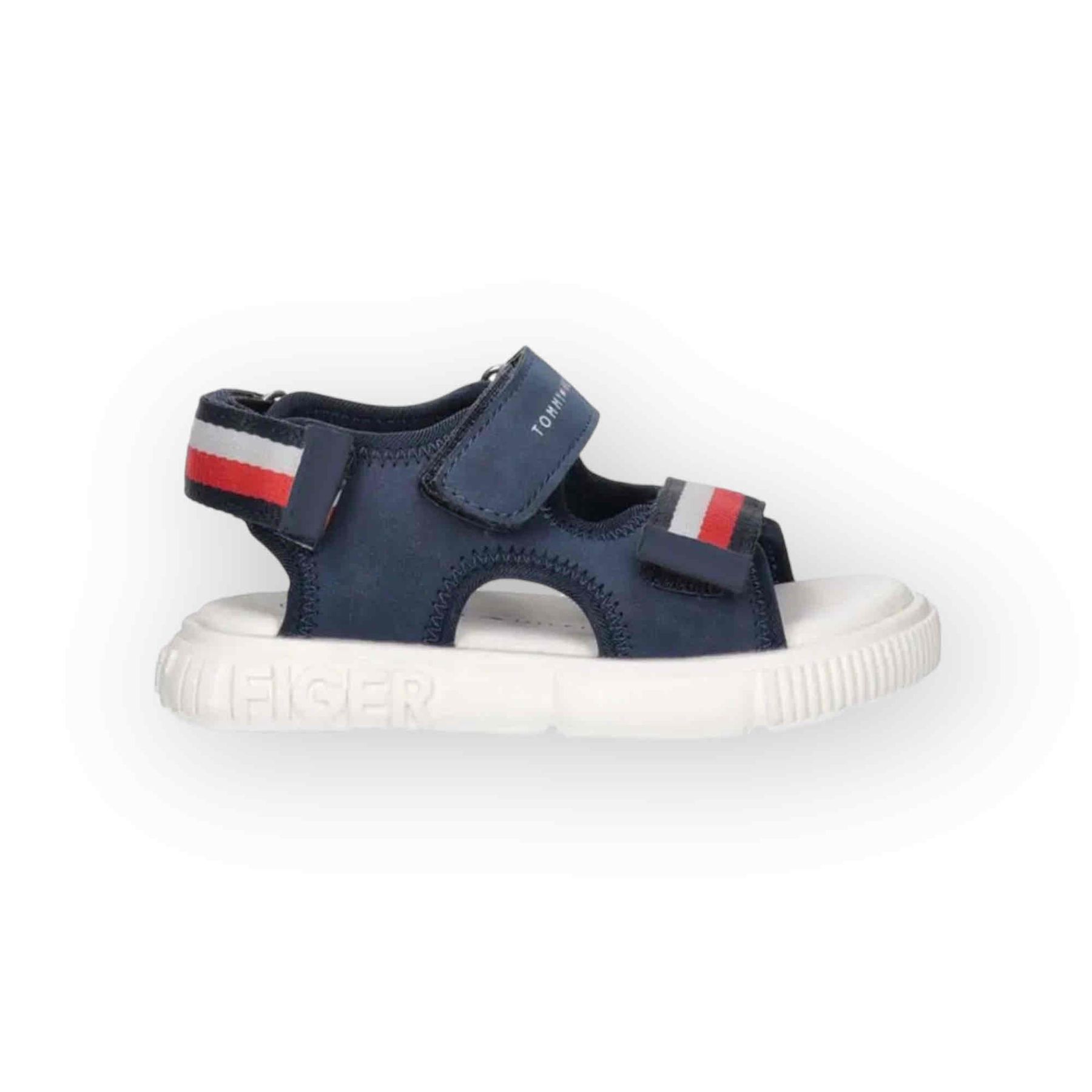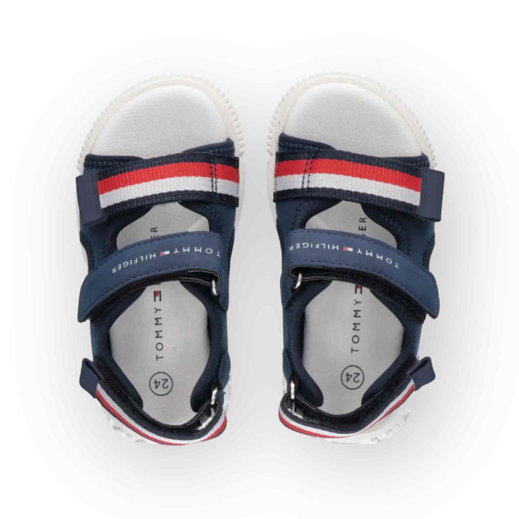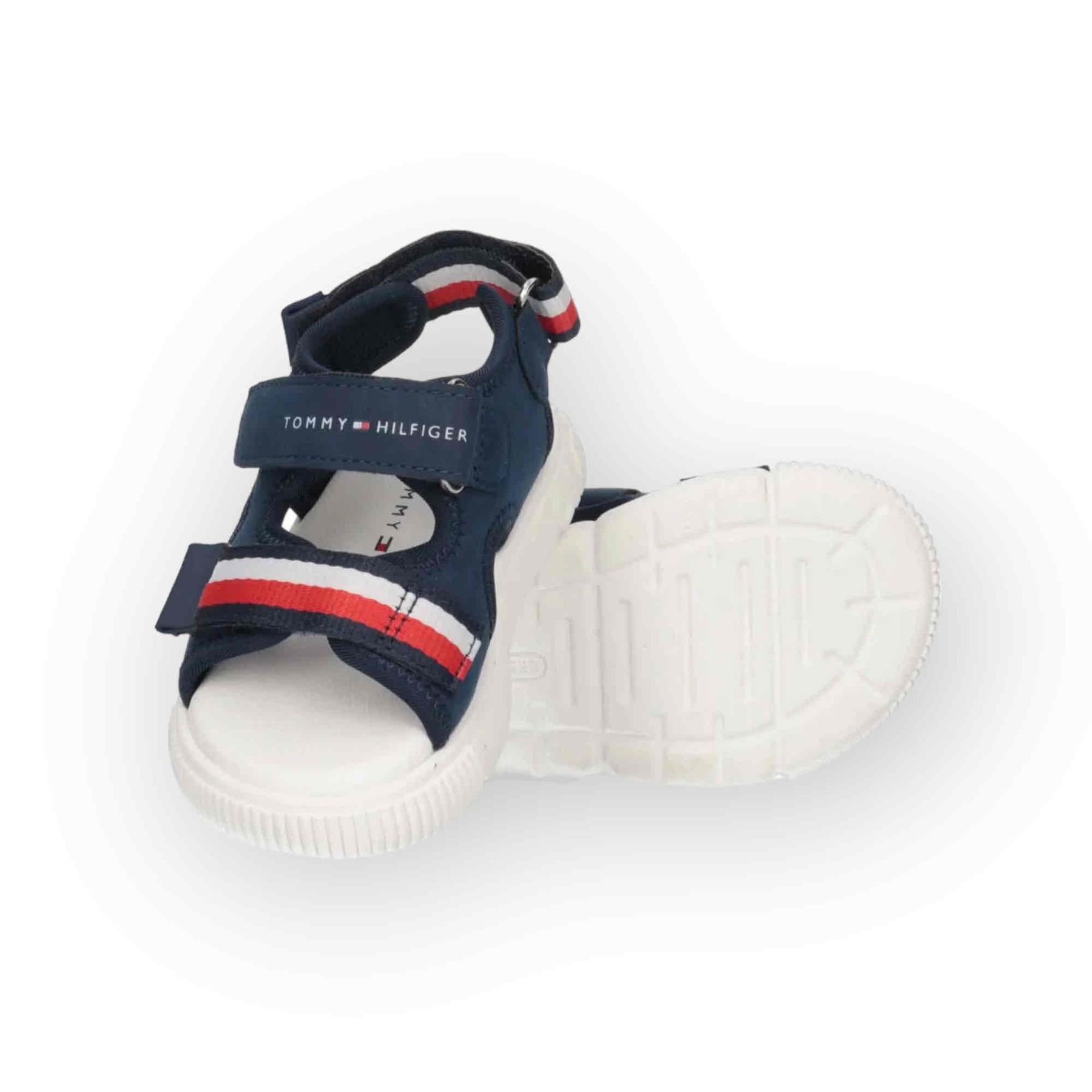 Sandali da bambino di colore blu Tommy Hilfiger. La suola bianca è in gomma antiscivolo e sono presenti intarsi di colore rosso, bianco e blu sia su uno dei due cinturini a strappo anteriori che su quello posteriore. Il logo Tommy Hilfiger è applicato su uno dei due cinturini a strappo anteriori. Un sandalo comodo e pratico che risulta elegante ma anche colorato grazie agli intarsi presenti. Il modello è dotato di una comodissima chiusura con due cinturini a strappo anteriori e uno posteriore che lo rende pratico, di facile vestibilità e riduce il rischio che il bambino lo sfili. Una linea di sandali confortevole e sobria ma che garantisce una praticità e un’eleganza adatte a ogni tipo di abbigliamento.