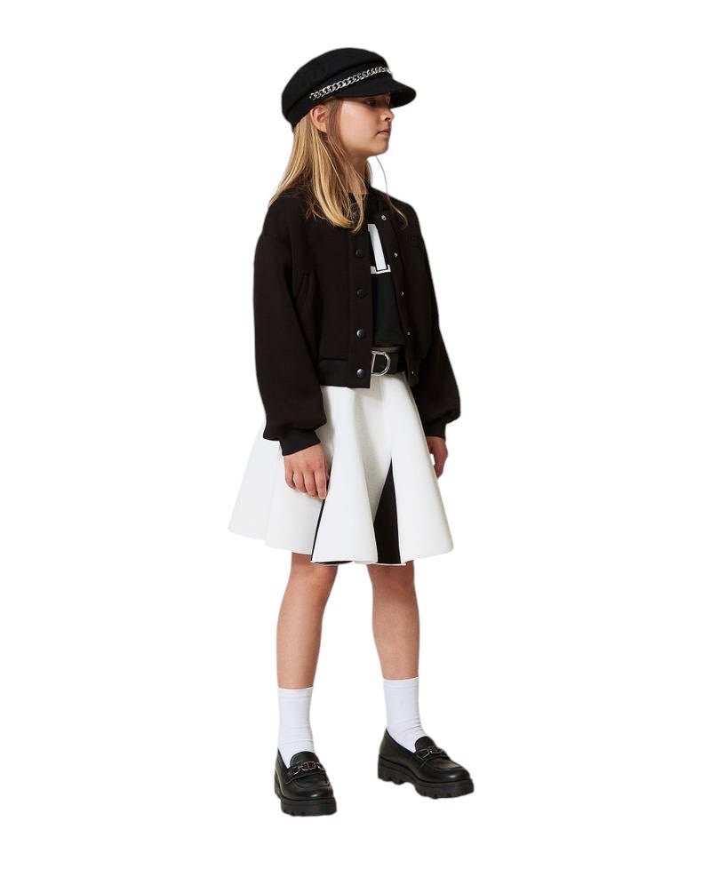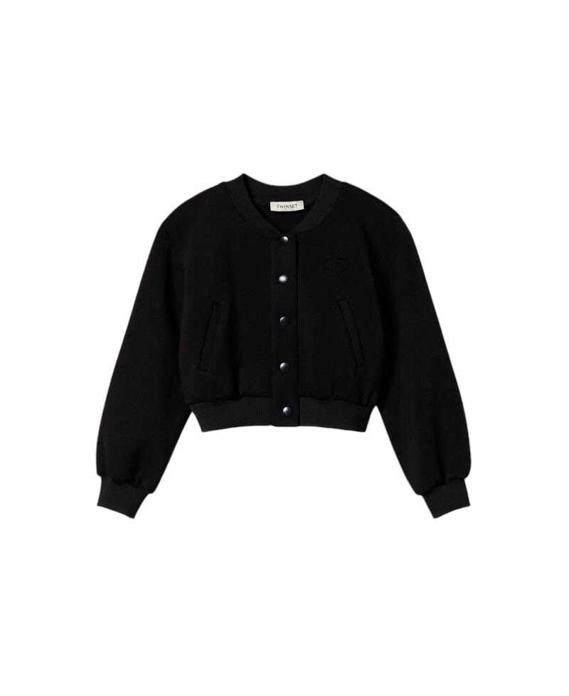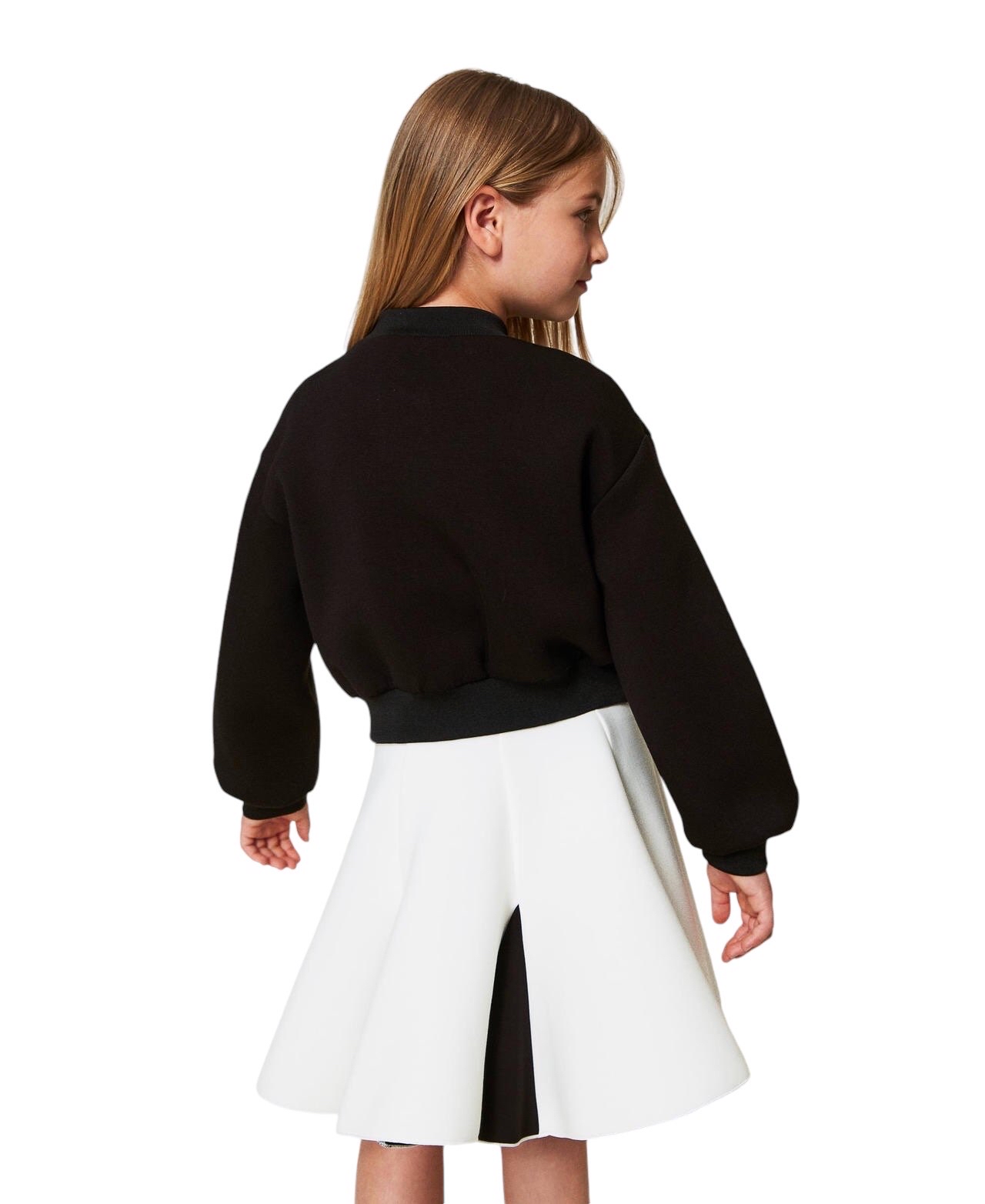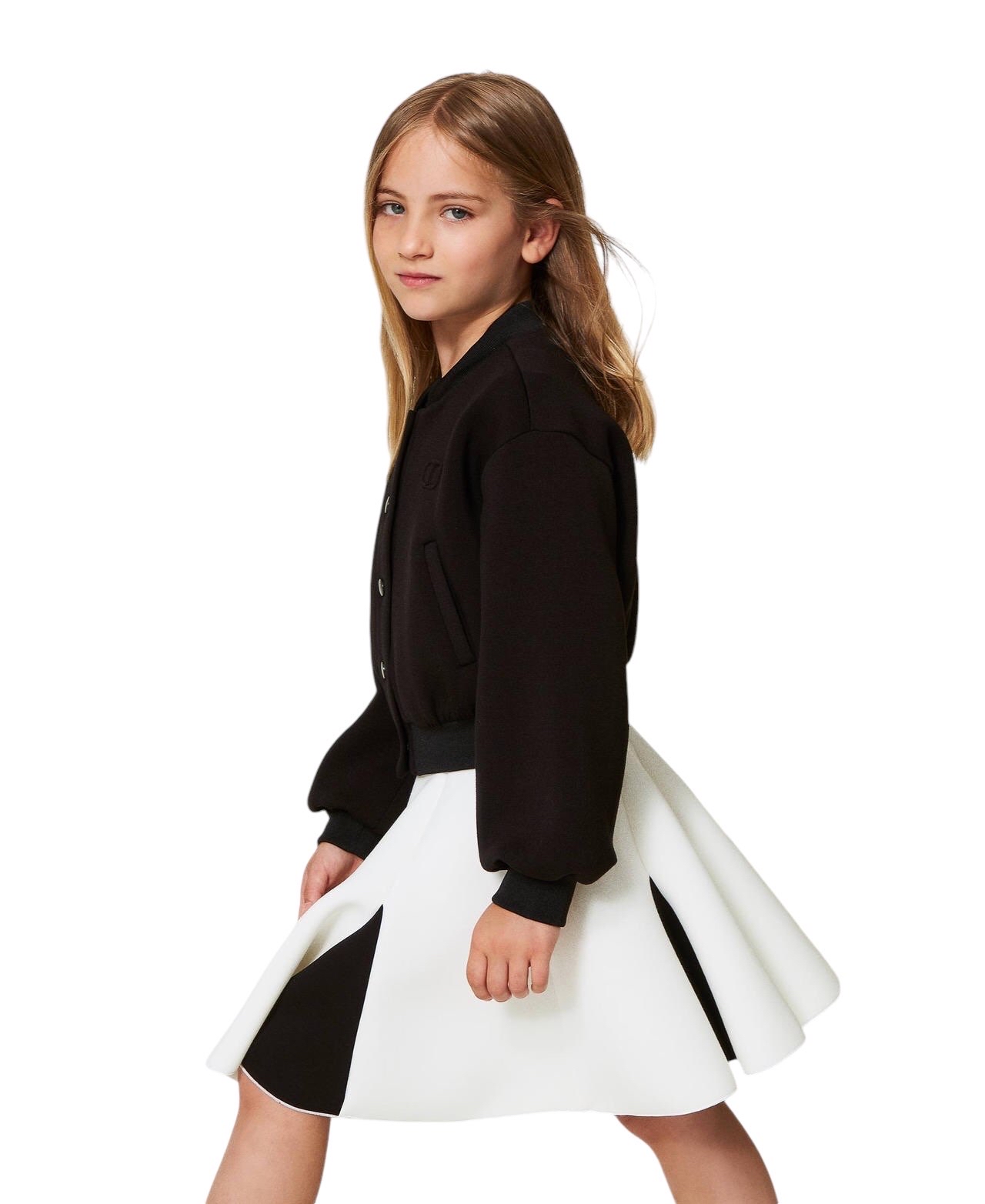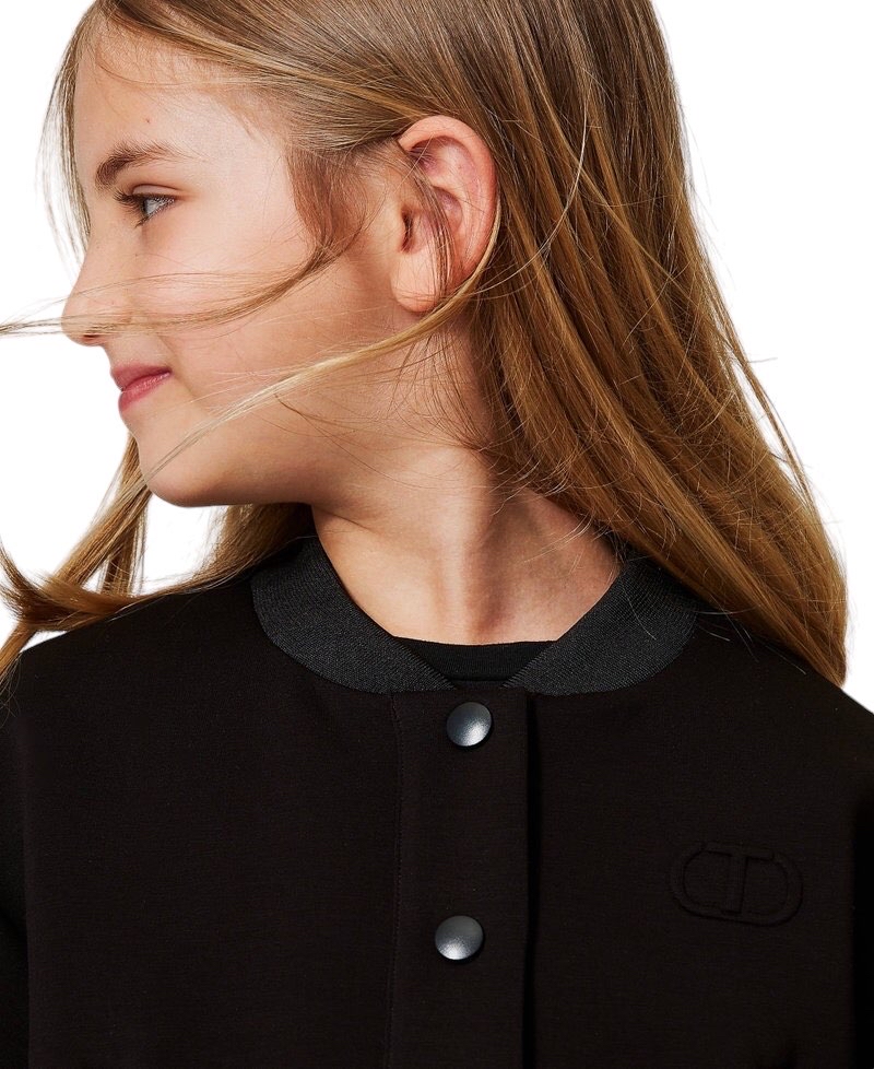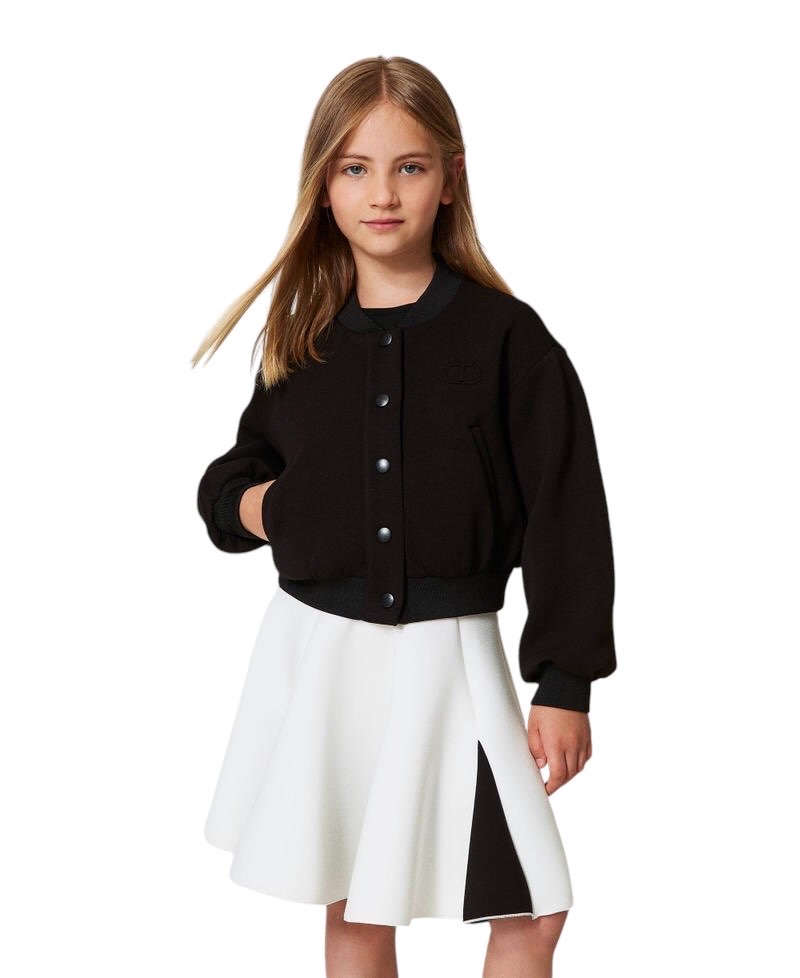 Bomber da bambina in tessuto scuba con fondi a costine, chiusura con bottoni a pressione, tasche a filetto laterali. Ha le spalle leggermente scese, logo embossed sul lato, sfoderato, linea morbidaCodice prodotto: 242GJ2010 Nero Questo bomber ha una linea morbida. Altezza modella: 128 cm. Taglia indossata: 8 anni 76% viscosa 16% poliammide 8% elastan. Materiale 2: 95% poliestere 5% elastan Lavare a mano, Non trattare con cloro, Non usare asciugatrice, Non stirare, Non lavare a secco, Lavare a rovescio, Lavare in acqua fredda