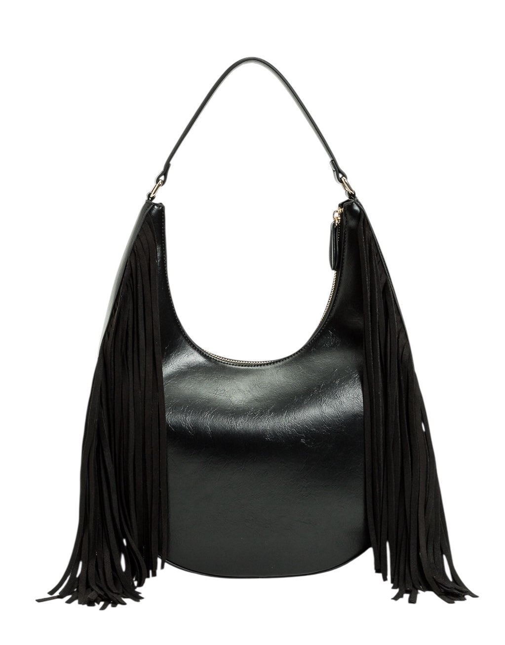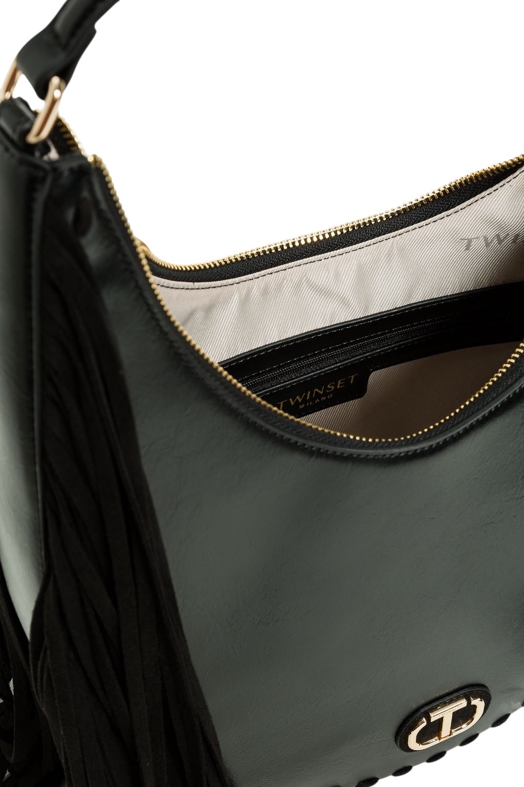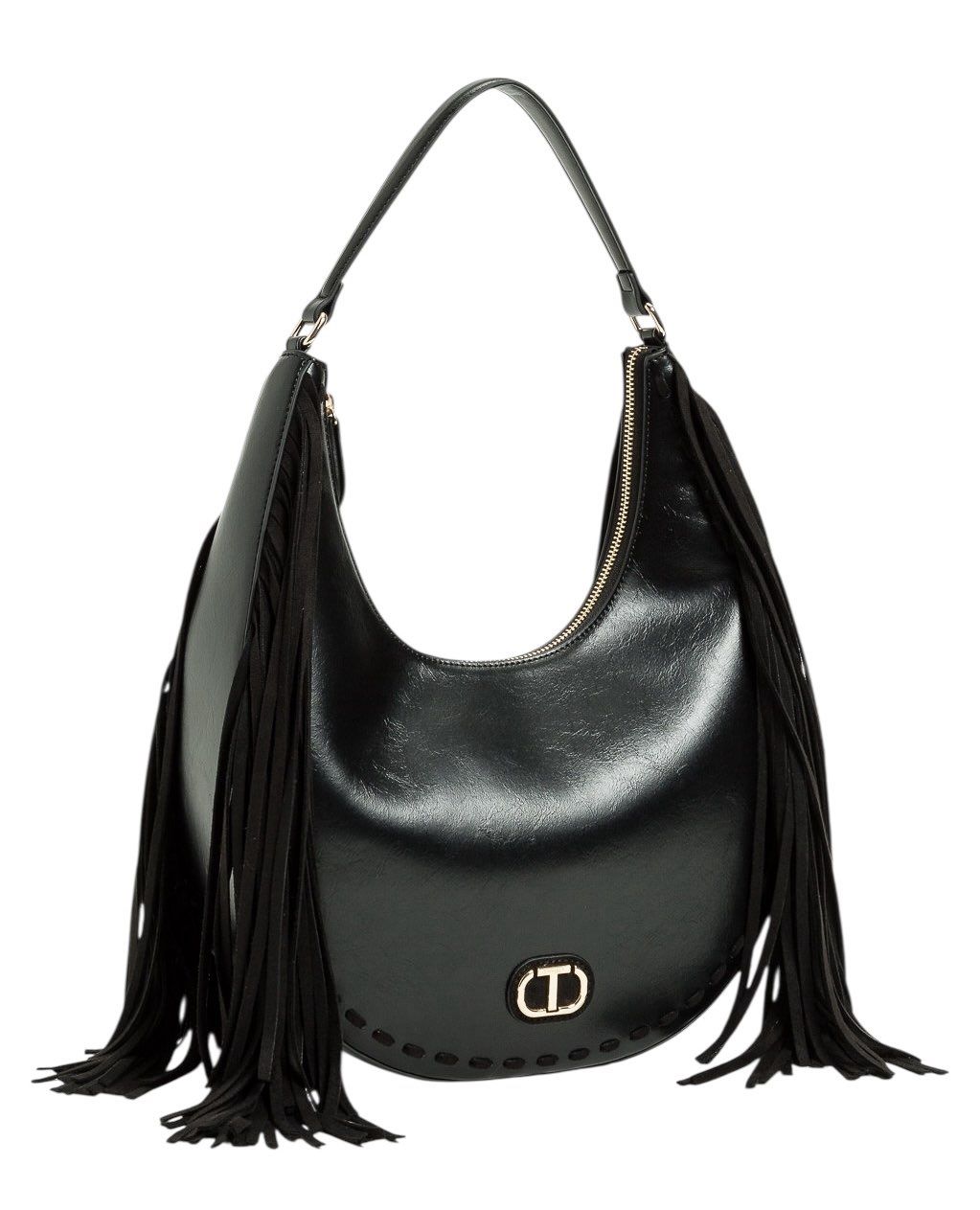 Un modello iconico dal fascino boho-chic: questa borsa hobo Twinset in similpelle marrone è arricchita da lunghe frange laterali e dettagli raffinati. La forma a mezza luna si abbina alla chiusura con zip dorata e al logo "T" frontale in metallo, per un look moderno e di carattere.