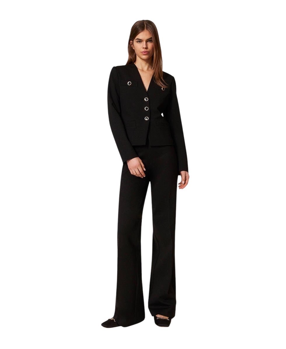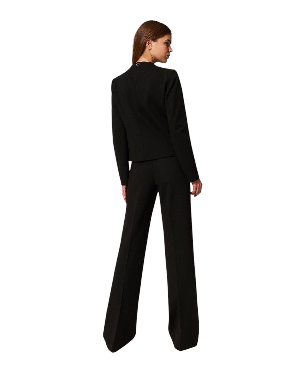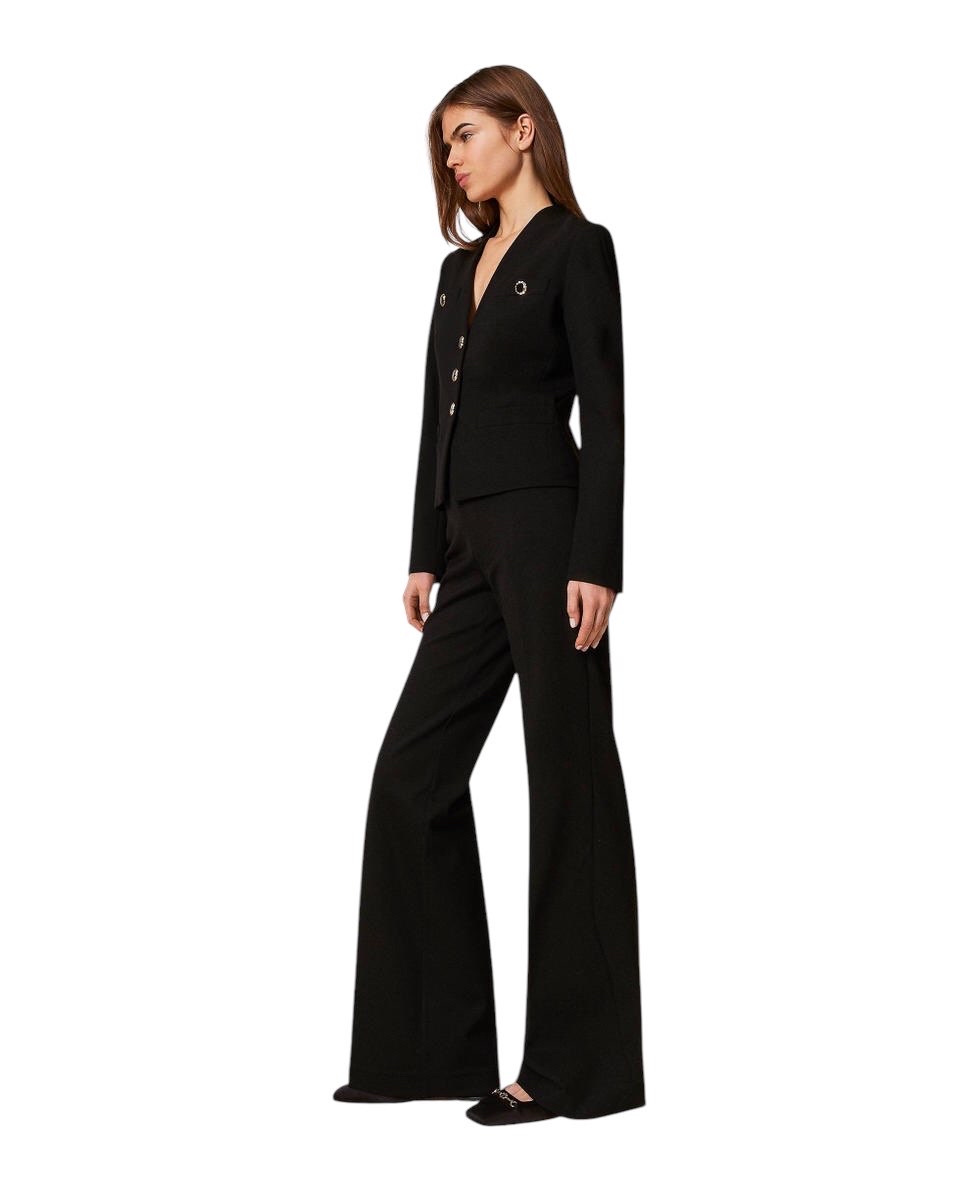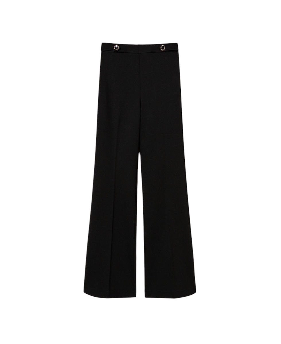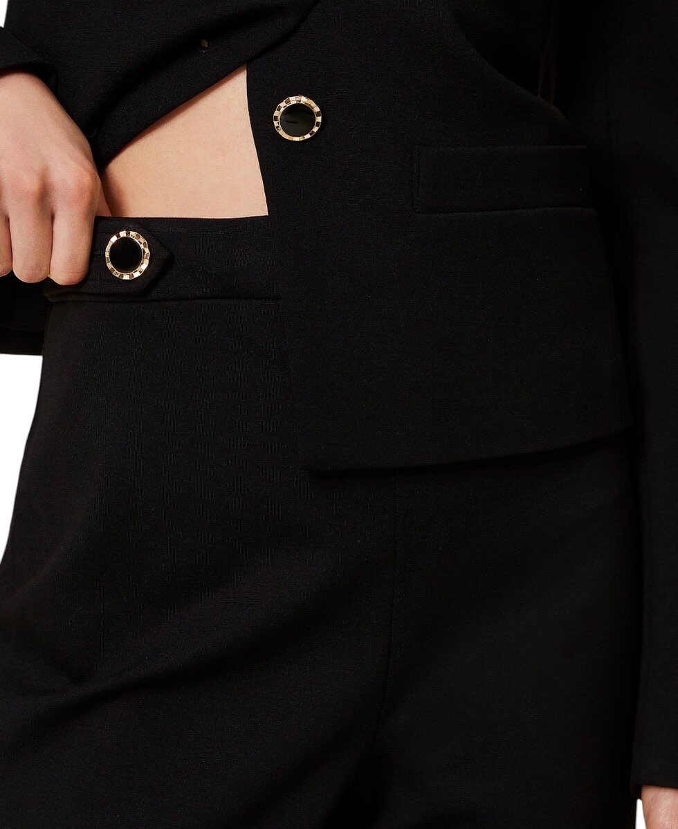 Pantaloni in jersey di misto viscosa con armatura punto Milano e alamari davanti con bottoni gioiello in smalto nero profilati da bordo color oro sfaccettato. Ha vita regular, chiusura con zip al fianco, tasche a doppio filetto e placchetta logo Oval T sul retro, piega stirata, linea ampia
