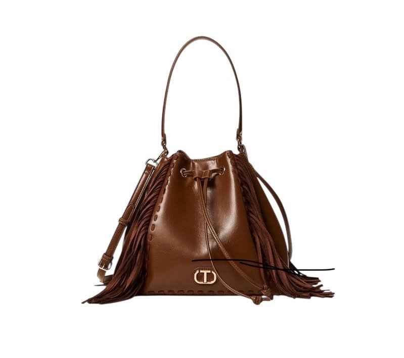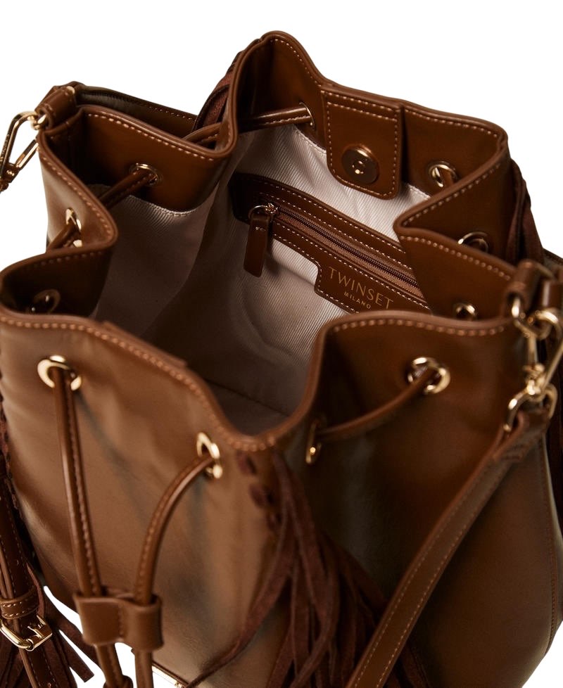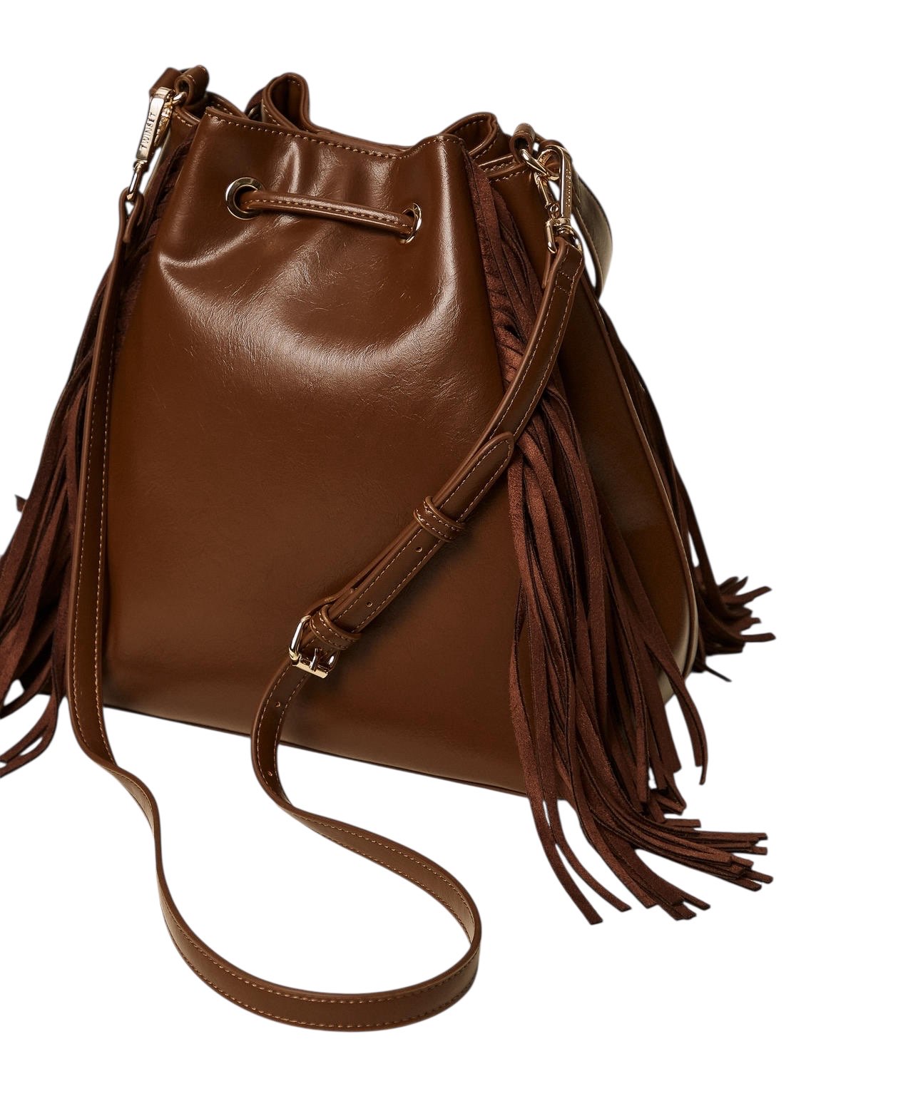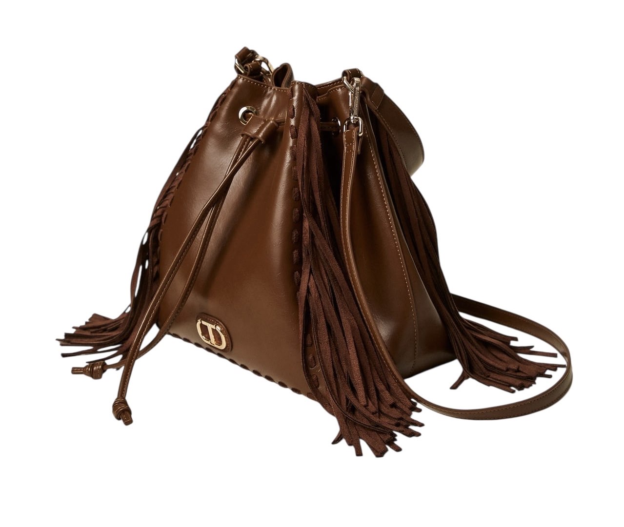 Borsa a secchiello 'Melrose' effetto vacchetta naturale lucida con frange morbide in microfibra in tinta effetto suede. Ha chiusura con coulisse, manico a spalla, tracolla regolabile e rimovibile da indossare cross-body, logo Oval T in metallo, foderata.