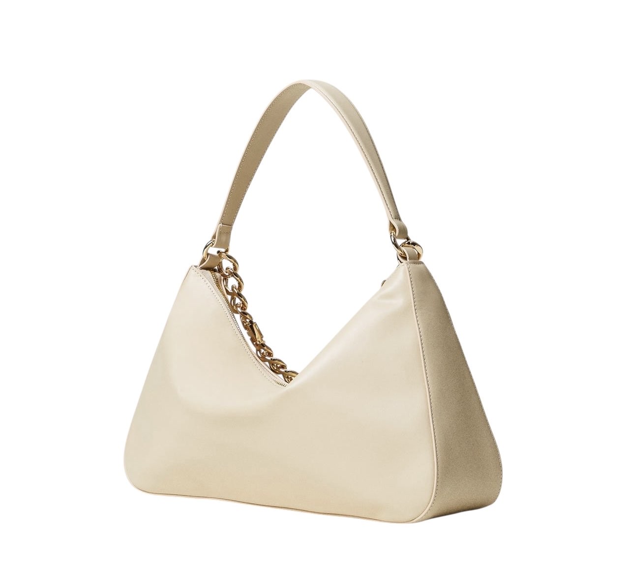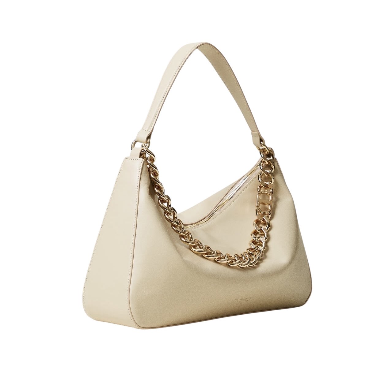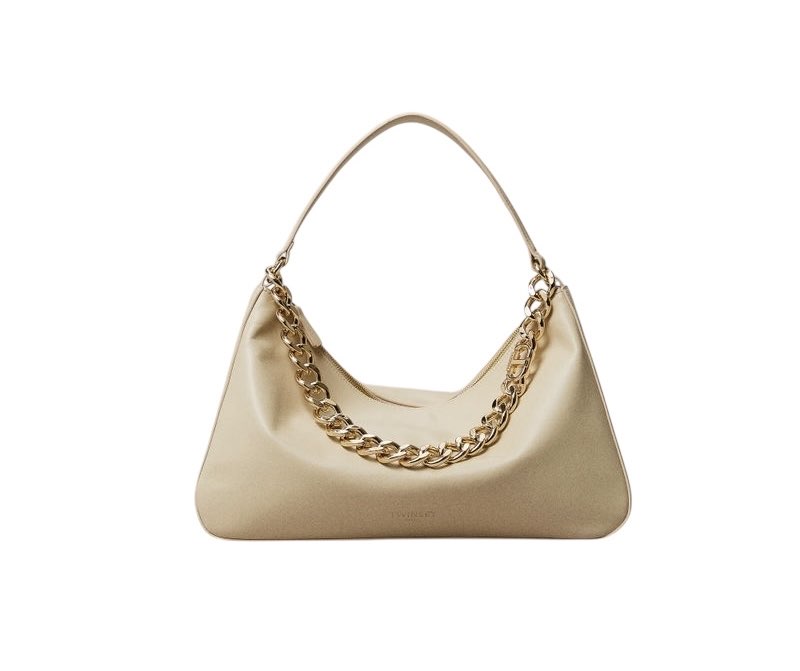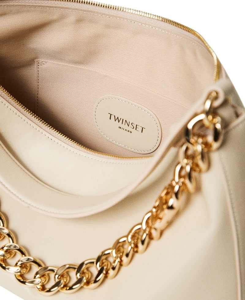 Borsa hobo 'Liliane' made in Italy, realizzata in pelle di vitello liscio pieno fiore con trattamento anti goccia e antigraffio. Il corpo è realizzato a colonna, con logo impresso a caldo, e foderato con un twill in misto cotone. Ha due manici staccabili, da indossare simultaneamente o separati per diverse interpretazioni di styling: uno in pelle sagomato e imbottito, l'altro è una catena in lega leggera in galvanica oro con l'Oval T inserito tra le maglie.