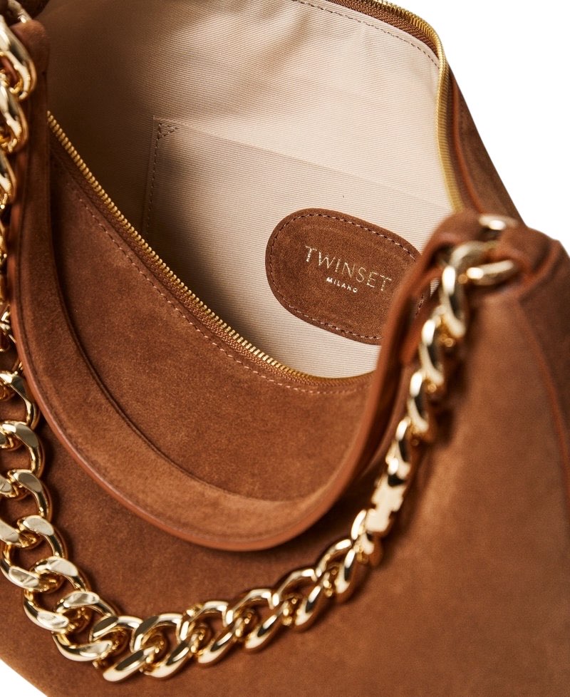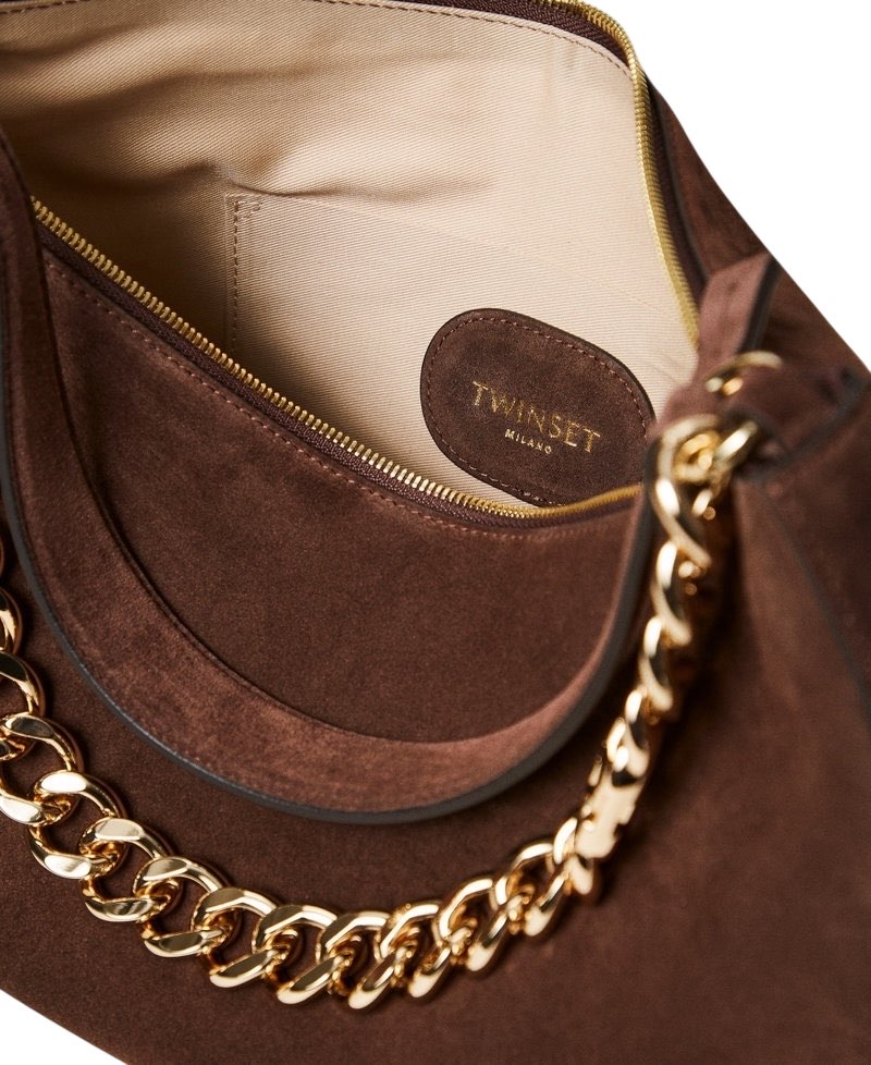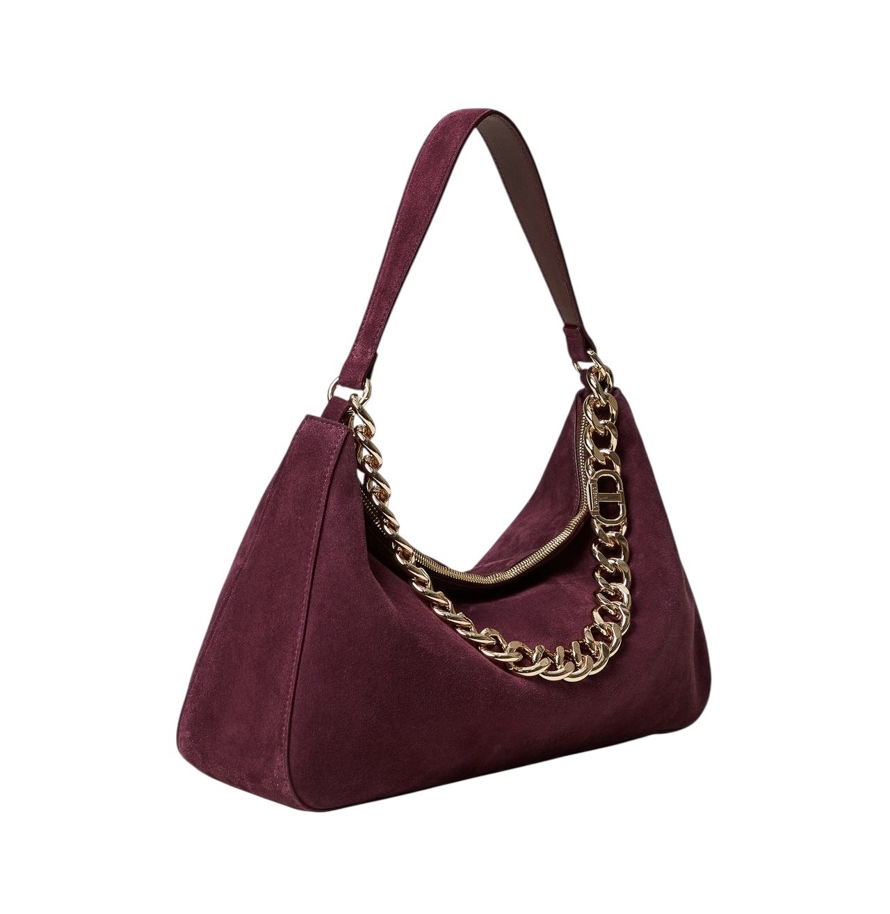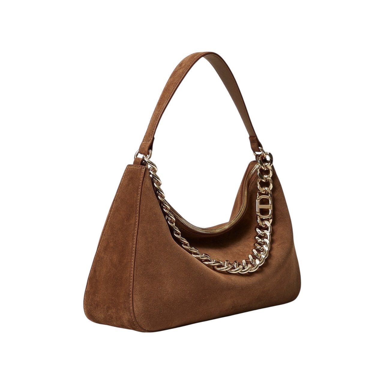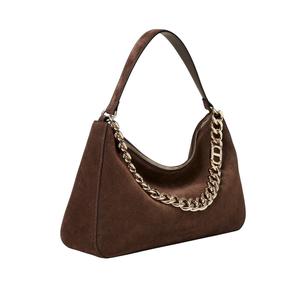 Borsa hobo 'Liliane' made in Italy, realizzata in pelle scamosciata con trattamento anti stingimento. Il corpo è realizzato a colonna con un rinforzo in microfibra, con logo impresso a caldo, e foderato con un twill in misto cotone. Ha due manici staccabili, da indossare simultaneamente o separati per diverse interpretazioni di styling: uno in pelle sagomato e imbottito, l'altro è una catena in lega leggera in galvanica oro con l'Oval T inserito tra le maglie.