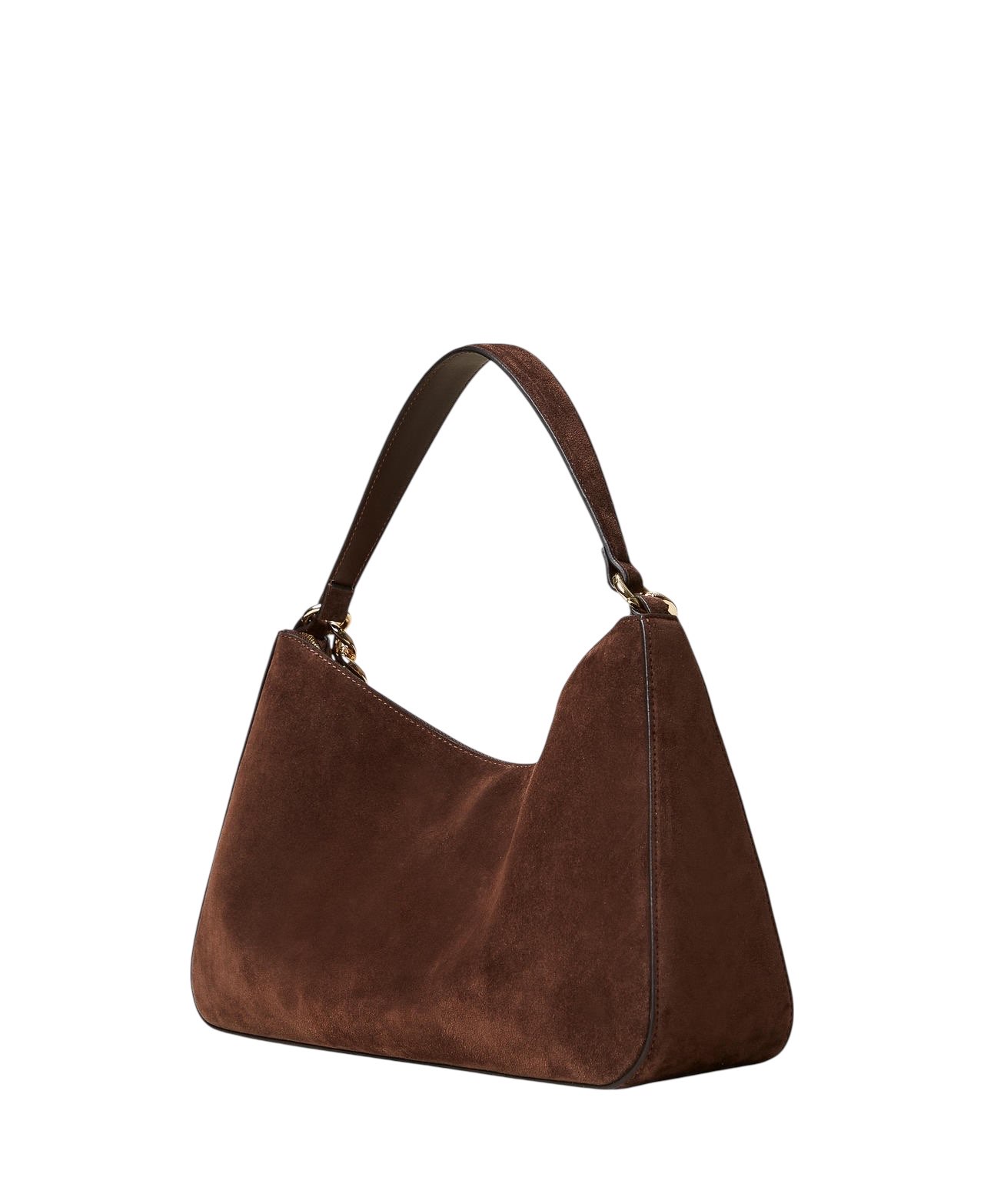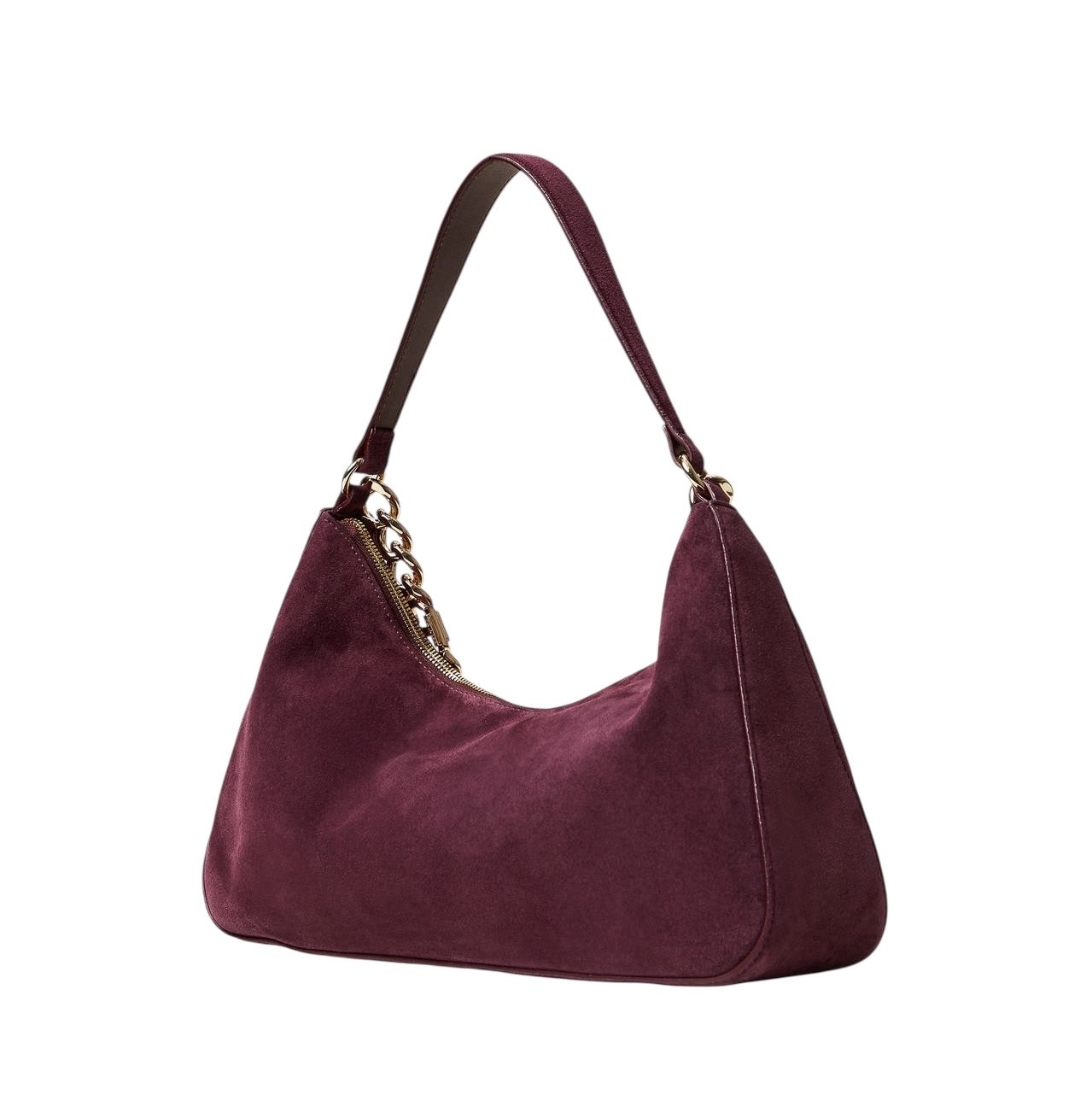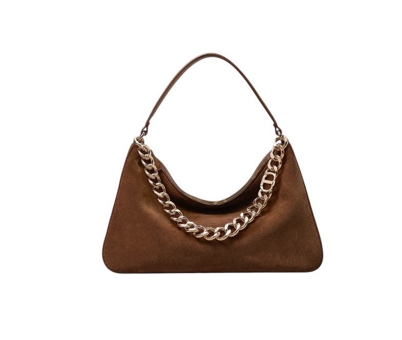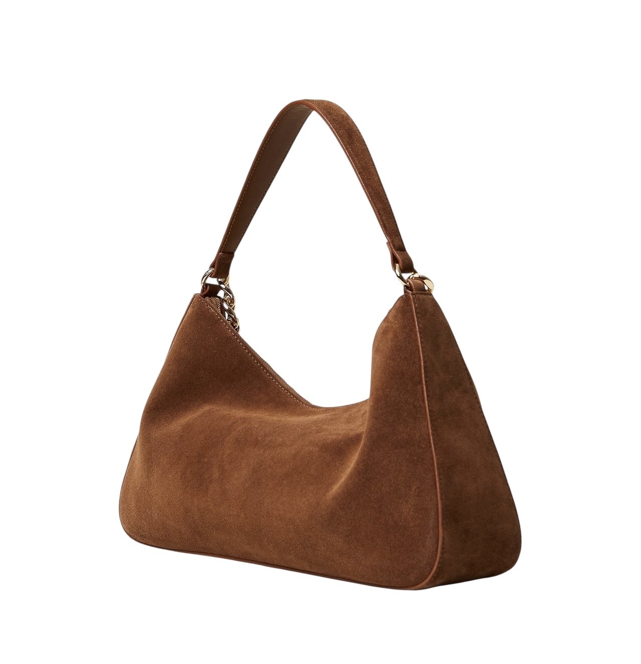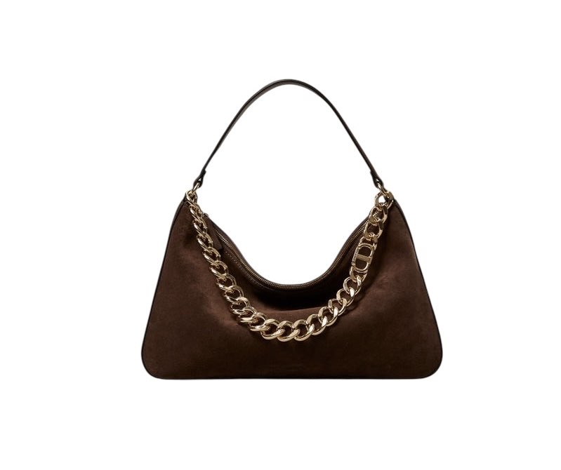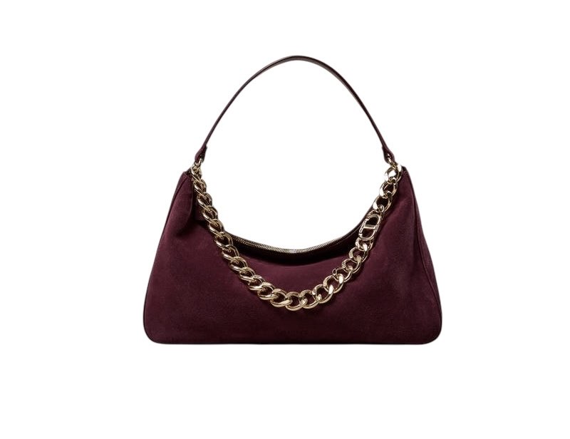 Borsa hobo 'Liliane' made in Italy, realizzata in pelle scamosciata con trattamento anti stingimento. Il corpo è realizzato a colonna con un rinforzo in microfibra, con logo impresso a caldo, e foderato con un twill in misto cotone. Ha due manici staccabili, da indossare simultaneamente o separati per diverse interpretazioni di styling: uno in pelle sagomato e imbottito, l'altro è una catena in lega leggera in galvanica oro con l'Oval T inserito tra le maglie.