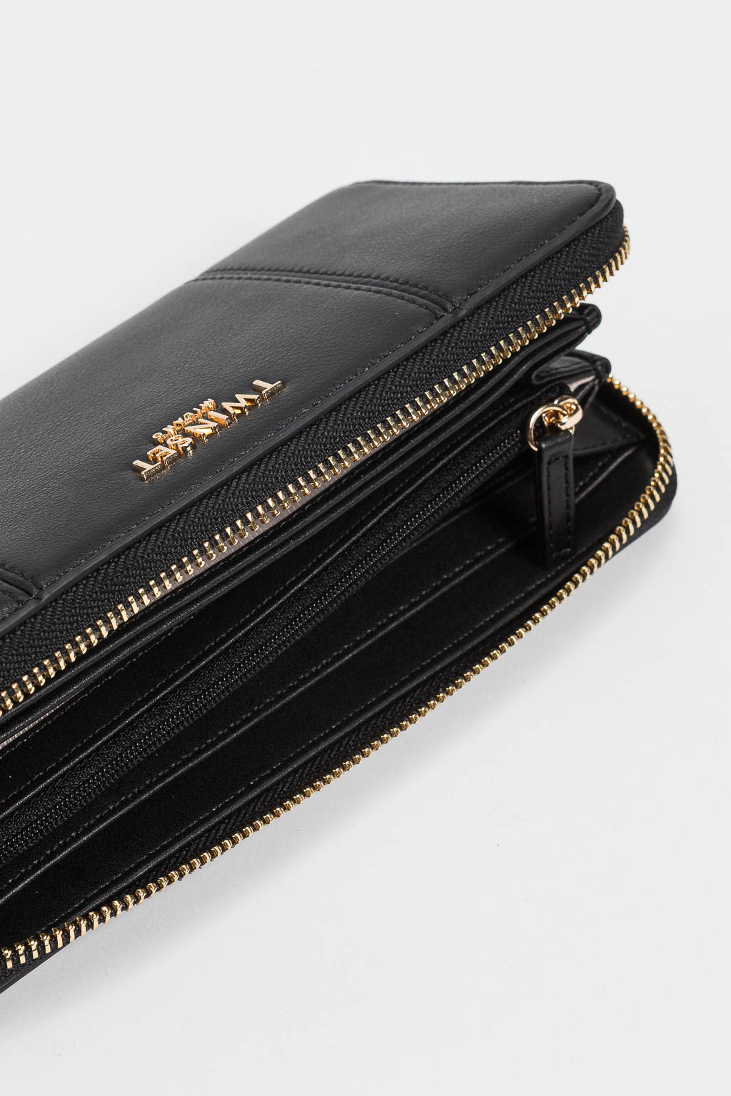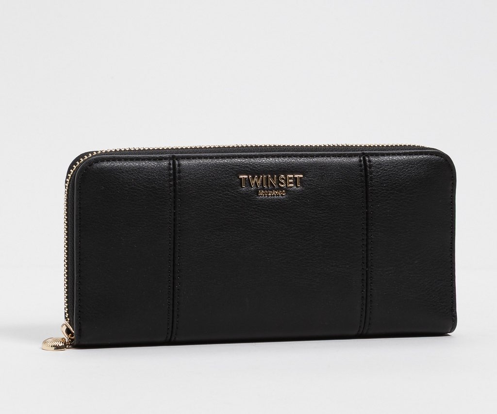 Portafoglio zip around effetto pelle morbida martellata con logo lettering in metallo. Ha triplo comparto interno a soffietto e zip centrale.