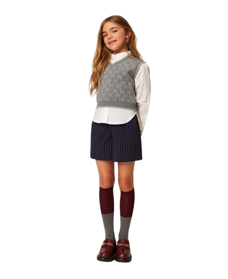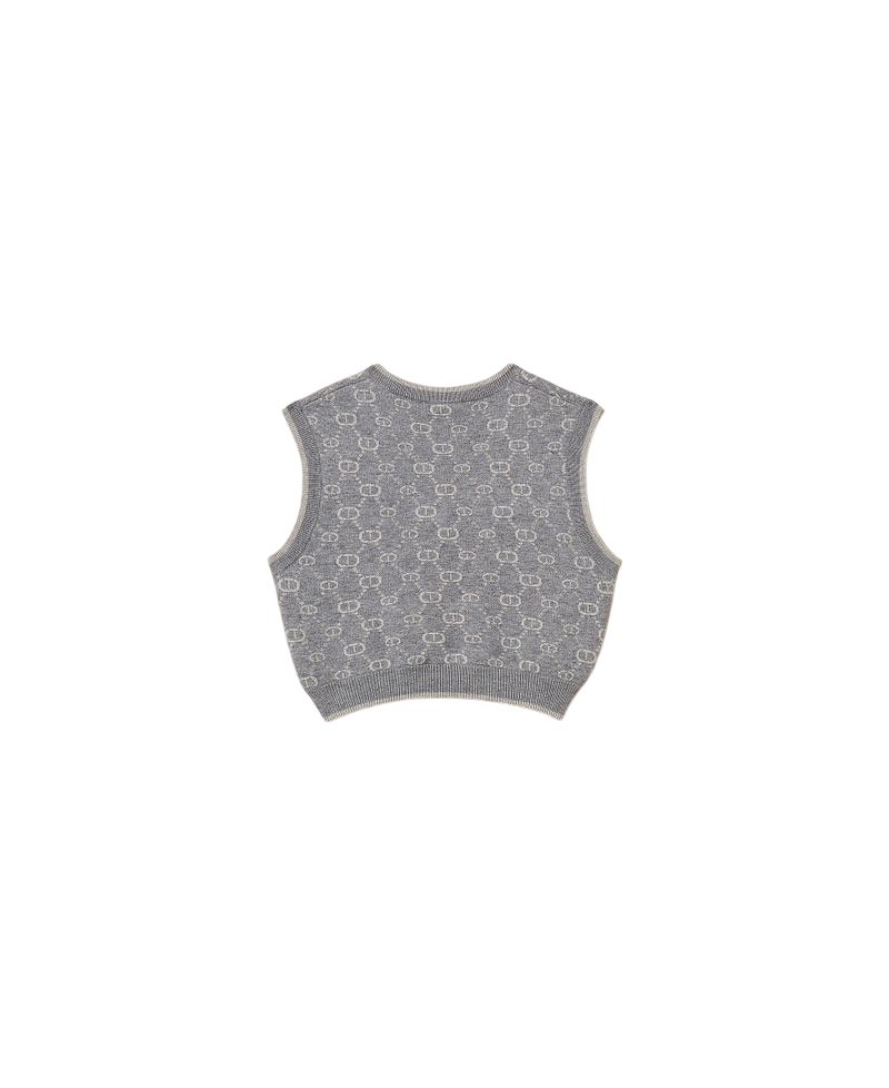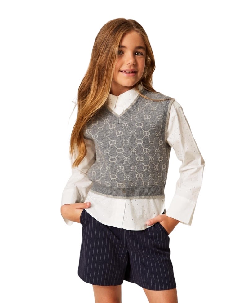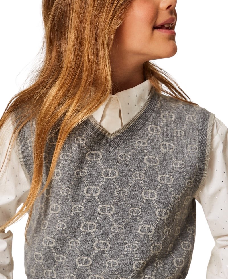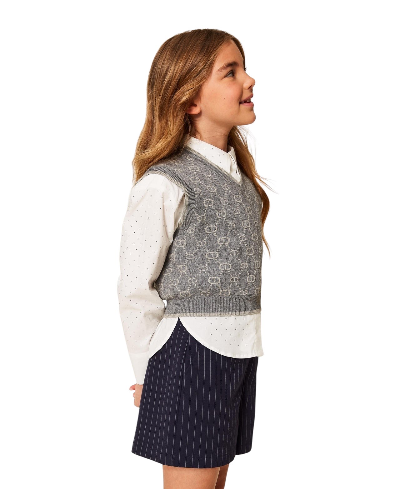 Gilet da bambina in maglia di misto viscosa jacquard con logo Oval T all over. Ha scollatura a V, profili a tinta unita, fondo a costine, linea dritta.