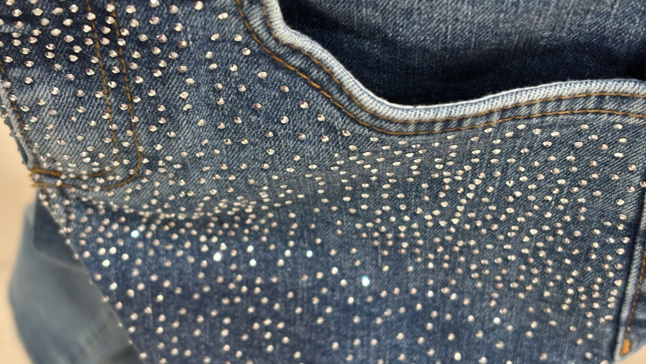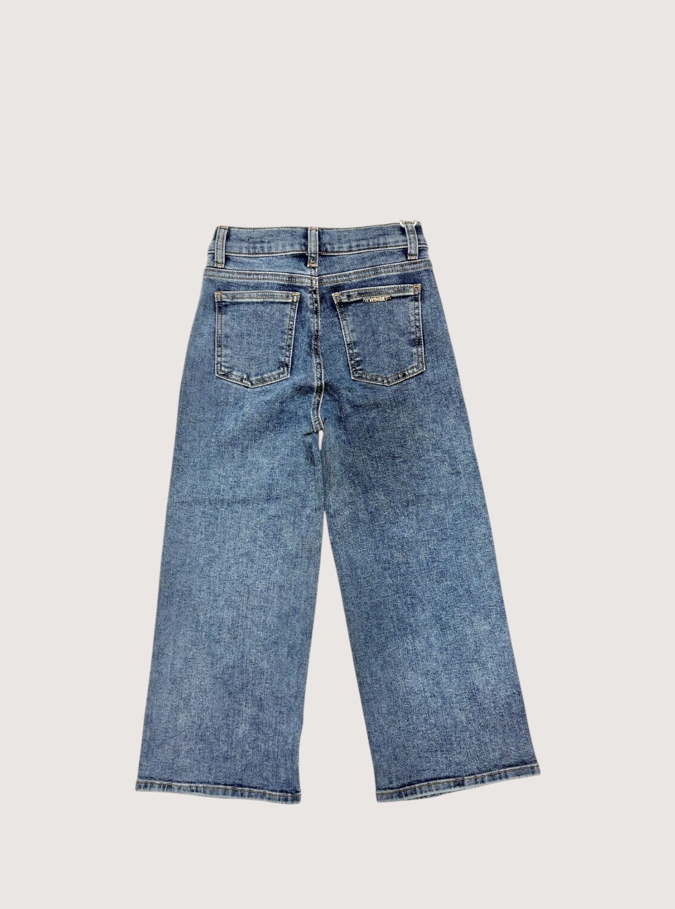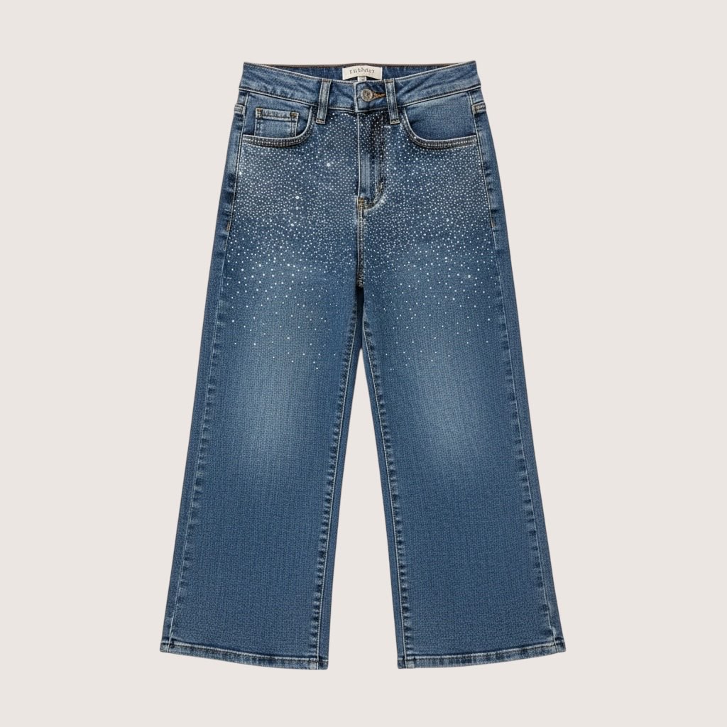 Jeans cropped da bambina in cotone stretch con al fondo e applicazione di strass termoadesivi. Hanno passanti in vita, cinque tasche, chiusura con zip e bottone logato, lavaggio blu medio, linea dritta.