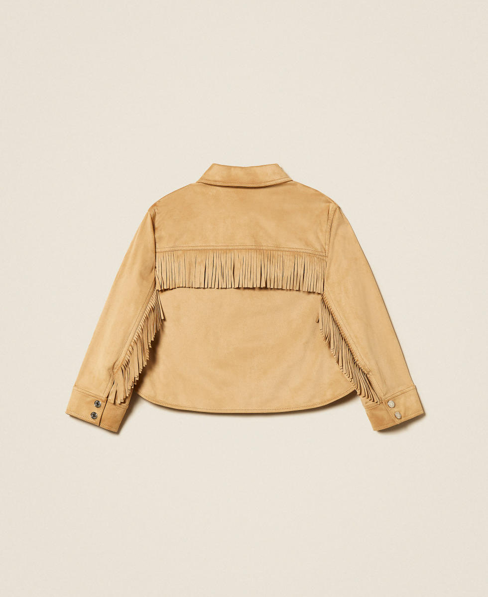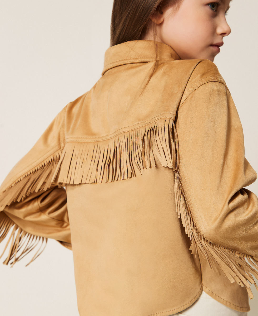 Giacca da bambina modello overshirt in tessuto effetto scamosciato con frange che rifiniscono maniche e taglio carré. Ha colletto a camicia, chiusura con bottoni a pressione logati, maniche lunghe con polsino e bottone, tasche applicate con patta, linea ampia.