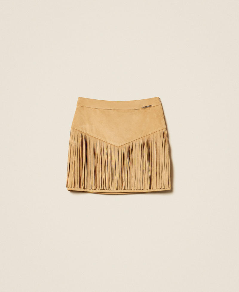 Gonna corta da bambina in tessuto effetto scamosciato con frange che rifiniscono il taglio baschina. Ha chiusura con zip invisibile al fianco, fodera, linea dritta.