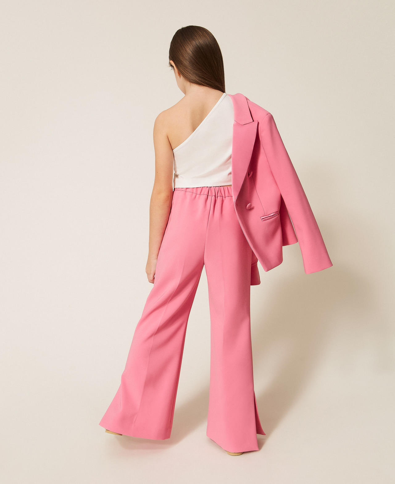 Pantaloni da bambina in crêpe con spacchi al fondo. Hanno elastico inserito in vita sul retro, chiusura con zip invisibile al fianco, linea flare.
