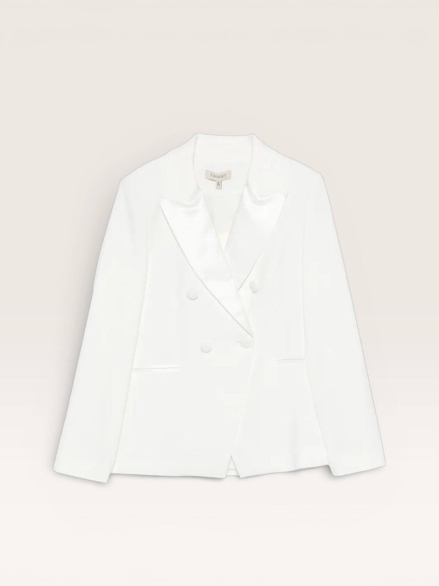 Giacca blazer da bambina in crêpe con dettagli in duchesse. Ha collo con revers, chiusura doppiopetto con bottoni, tasche a filetto, tagli fianchetto davanti e dietro, fodera, linea slim.