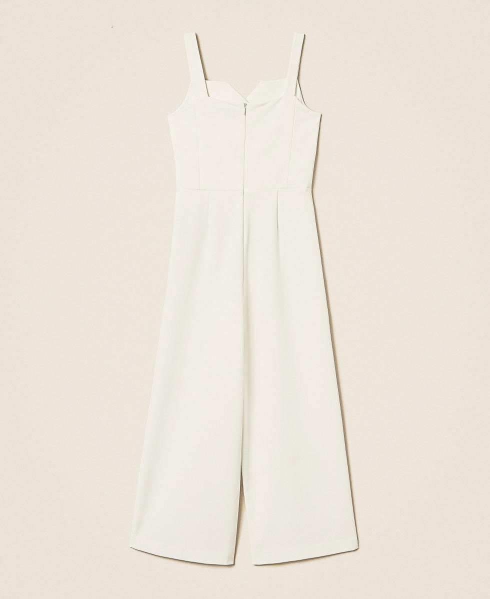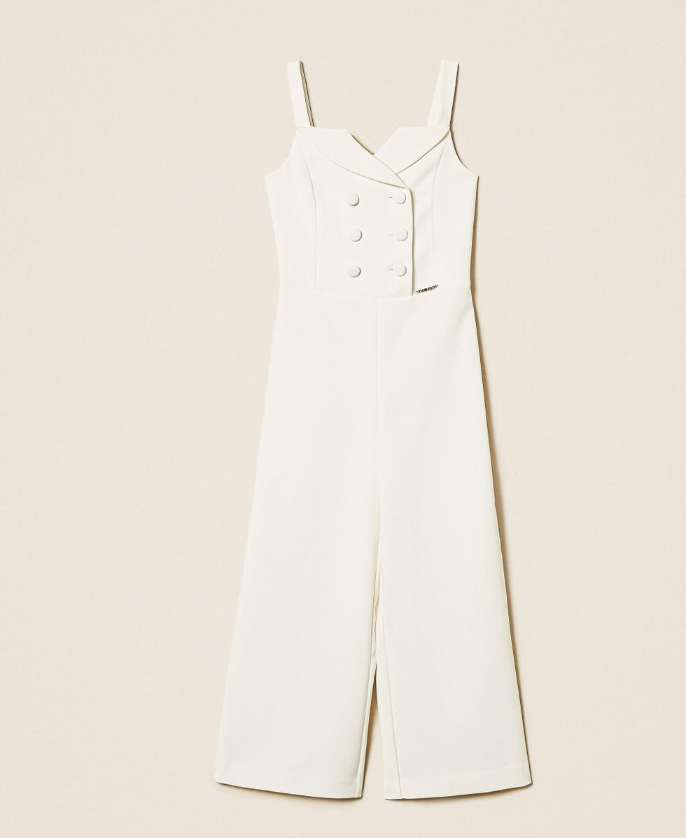 Tuta da bambina in crêpe con corpetto lavorato a doppiopetto con bottoni in tono. Ha spalline, chiusura con zip invisibile sul retro, taglio in vita, linea dritta.