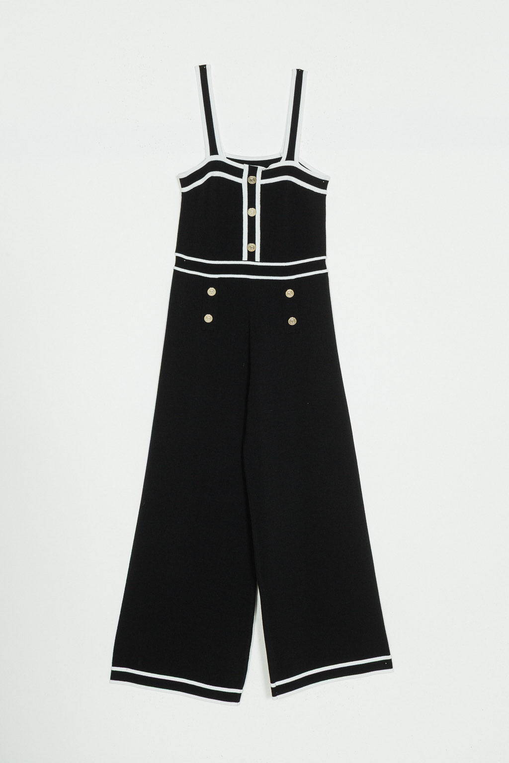 Questa elegante tuta di Twinset è caratterizzata da un profondo colore nero con delicati dettagli e righe bianche, che creano un look elegante e moderno. La tuta presenta splendidi bottoni sul davanti, che aggiungono un tocco raffinato e classico. Il tessuto confortevole è morbido sulla pelle e offre la massima libertà di movimento. Il suo design senza tempo la rende adatta sia per le occasioni casual che per quelle più formali. Grazie alla vestibilità dritta, è comoda e valorizzante. Le righe bianche aggiungono un contrasto giocoso e un tocco sportivo. Perfetta da abbinare a sneakers per un look casual o a scarpe eleganti per un outfit più formale. Una tuta elegante e versatile che ti piacerà indossare ancora e ancora.